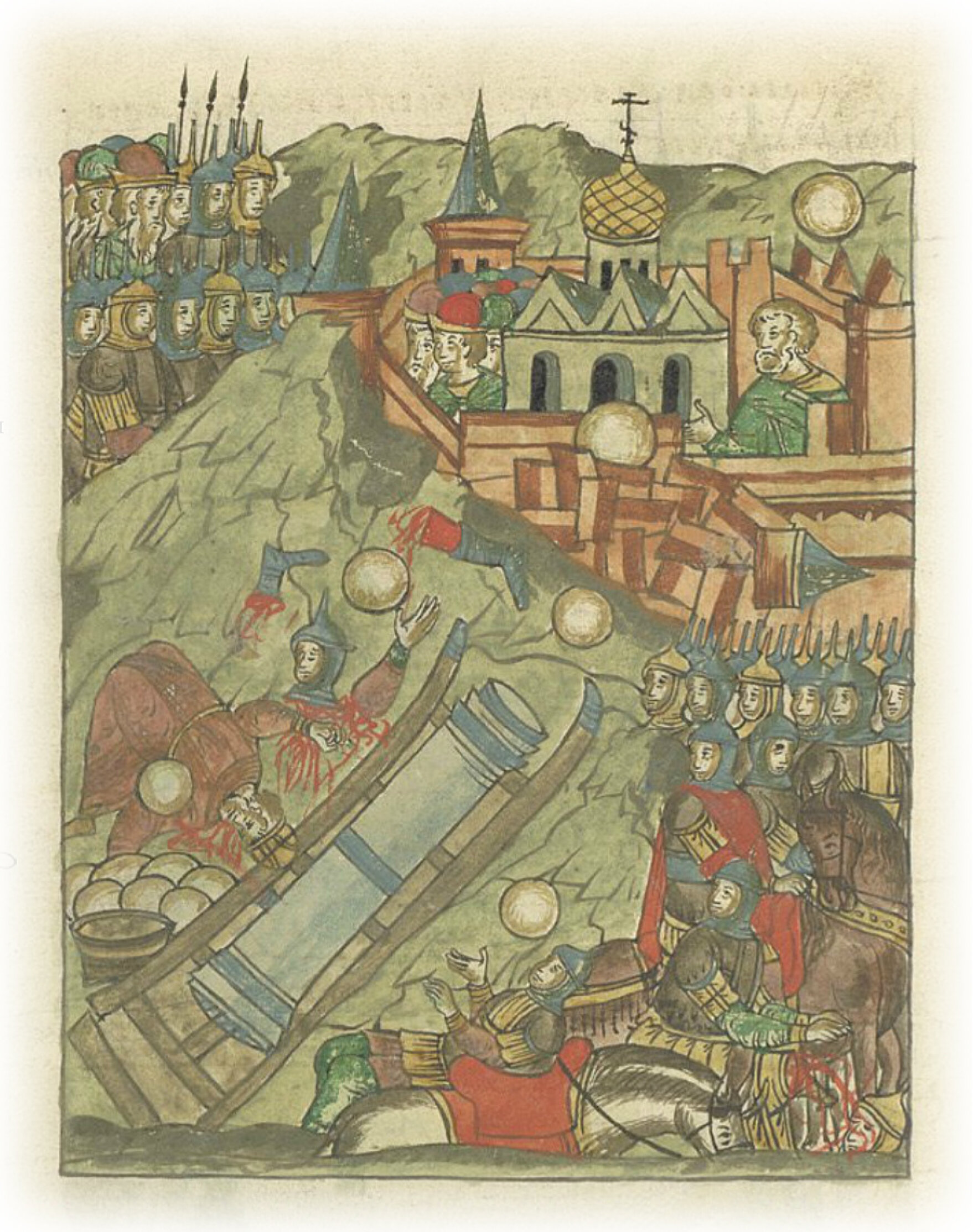 Языки говорят воеводам царя Ивана Васильевича, что магистр окопался большим рвом вокруг города Рындола, бьет из пушек и пищалей и приступает к Рындолу.