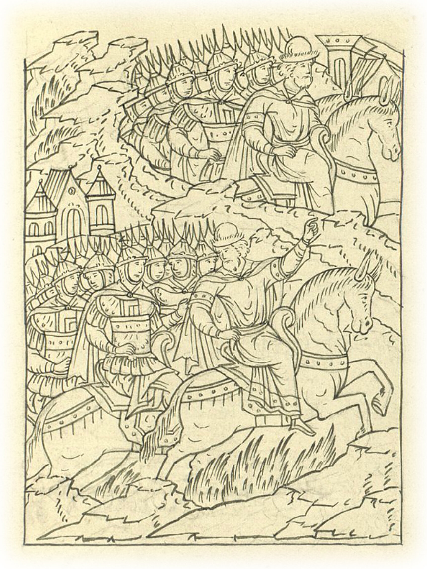 Языки говорят воеводам царя Ивана Васильевича, что магистр окопался большим рвом вокруг города Рындола, бьет из пушек и пищалей и приступает к Рындолу.