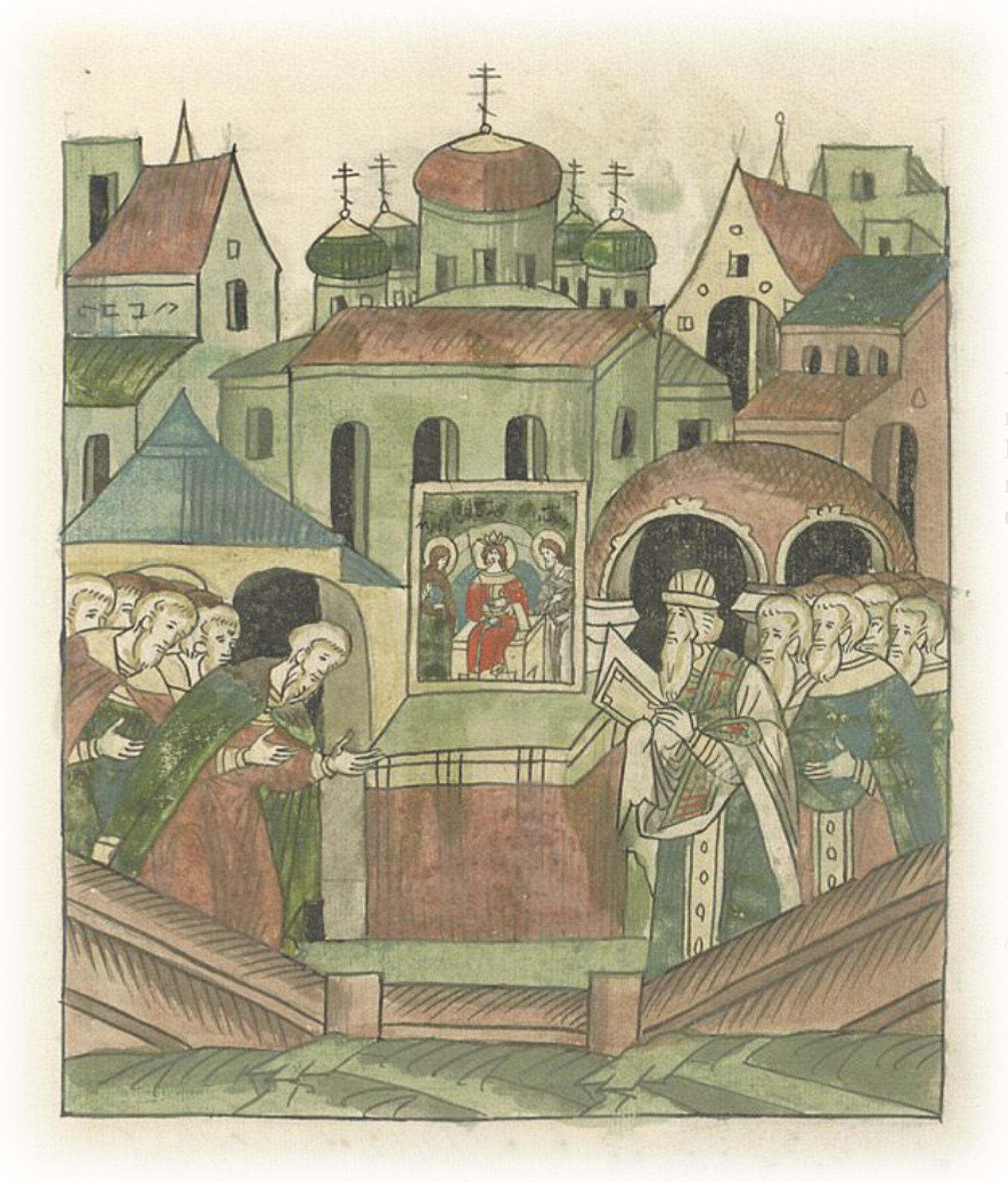 Великий князь Иван Васильевич с братьями князем Андреем Большим, князем Борисом, князем Андреем Меньшим и князем Василием Верейским, придя в Новгород, бьет челом перед иконой в церкви святой Софии Премудрости Божьей и слушает обедню.