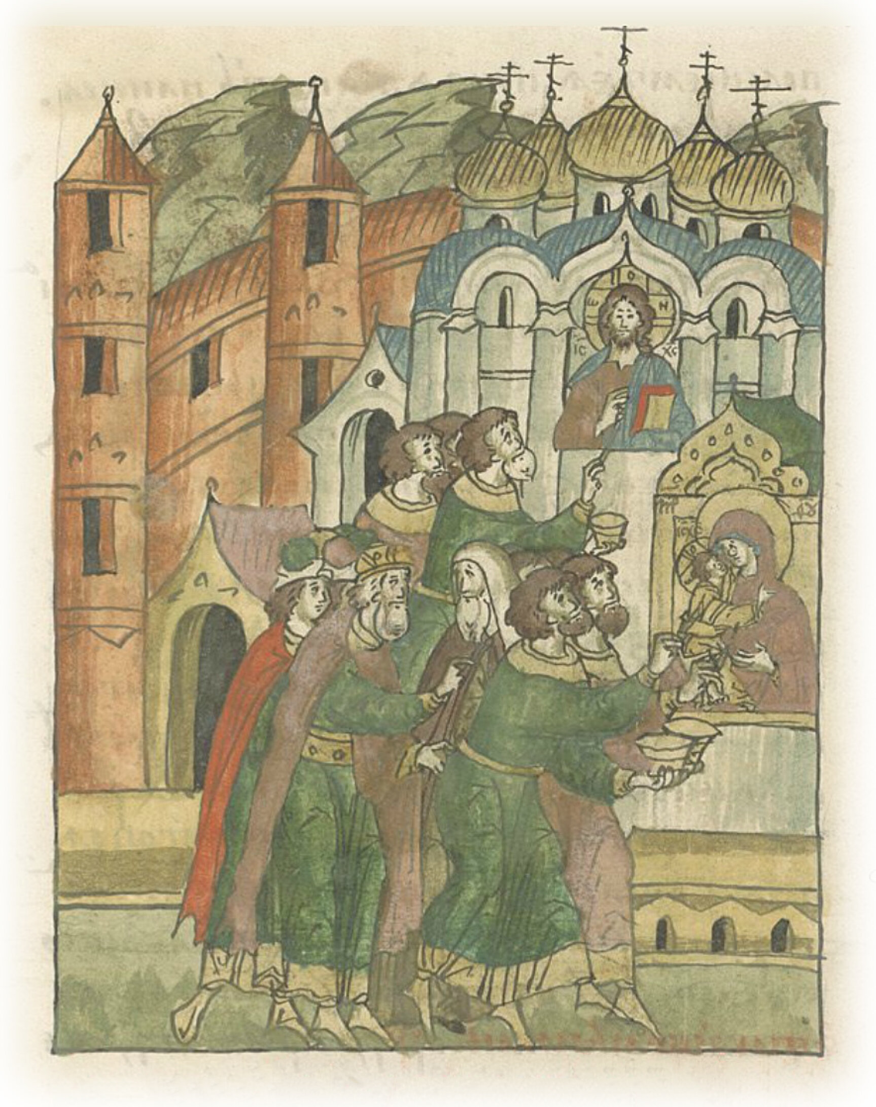 О поновлении иконы Пречистой Богородицы Владимирской. Повелением благоверного великого князя Василия Ивановича, всея Руси государя самодержца, по совету и благословению преосвященного Варлаама, митрополита всея Руси, был поновлен и украшен образ пречистой Владычицы нашей Богородицы и приснодевы Марии, Владимирская икона, которую по ее благословению, при ее жизни написал богогласный* Лука апостол и евангелист. Каждый год ходят к Сретению пречистой Богородицы мая месяца в 21 день. Эту же чудную икону пречистой Богородицы принес из Царьграда благоверный князь Андрей Боголюбский, сын великого князя Юрия Долгорукого Владимировича Мономаха, и поставил ее в соборной церкви святой Богородицы во Владимире в 6662 (1154) году; и стояла она во Владимире 240 лет. Потом же, в 6903 (1395) году (месяца) августа в 26 день повелением благоверного великого князя Василия Дмитриевича, по совету Киприана, митрополита всея Руси, в связи с нахожением безбожного царя ТемирАксака она принесена была из Владимира на Москву и поставлена была в соборной церкви честного и славного ее Успения в славном городе Москве, где стоит и доныне. К сей же чудной иконе пречистой Владычицы нашей Богородицы повелел великий князь всея Руси Василий Иванович сделать киот и украсить серебром и золотом, и также с верою и любовью повелел расписать храм ее честного и славного Успения во славу Господу Богу Спасу нашему Исусу Христу и пречистой Его матери. * воспевающий Бога.