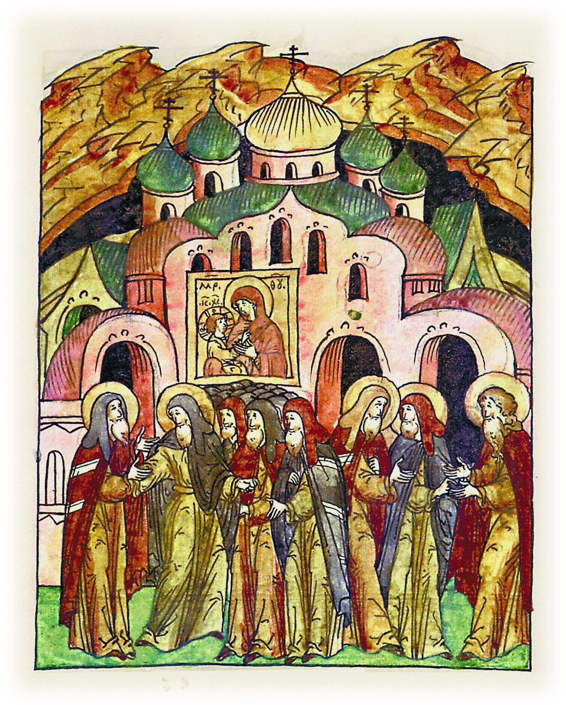 И весть за вестью приходила, что идет Константин митрополит, Нифонт же с особой радостью ждал его. Тогда пришла на него болезнь, и за три дня до кончины своей видел сон: снилось ему, что находится он в церкви Печерского монастыря на месте блаженного князя инока Николы Святоши и молится пречистой Богородице, чтобы видеть преподобного игумена Феодосия; и виделись ему многие братья, пришедшие в церковь; и один от них вышел, и приступив, сказал ему: «Если хочешь видеть Феодосия, пойди в алтарь». И ввел его в алтарь, и показал ему преподобного игумена Феодосия.