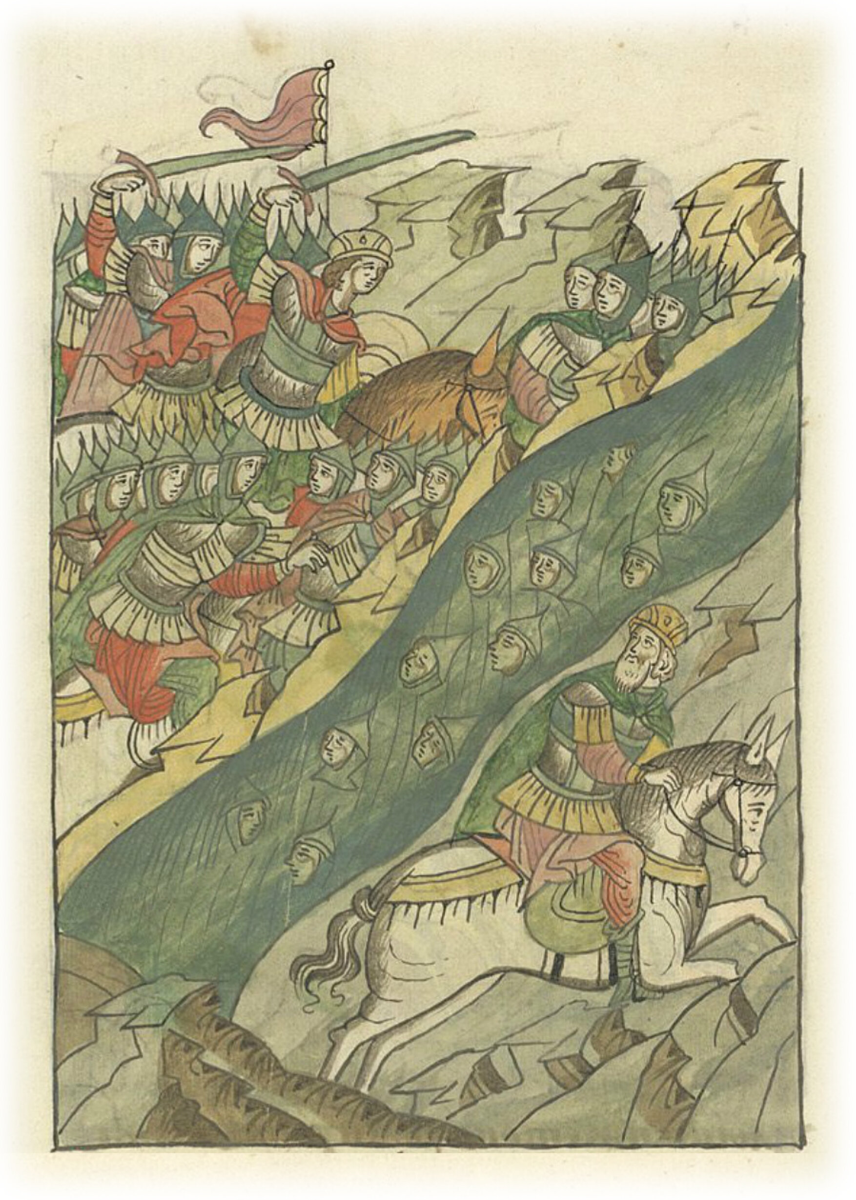 Воеводы царя Ивана Васильевича, разделившись, идут в погоню за царем Емгурчеем.
