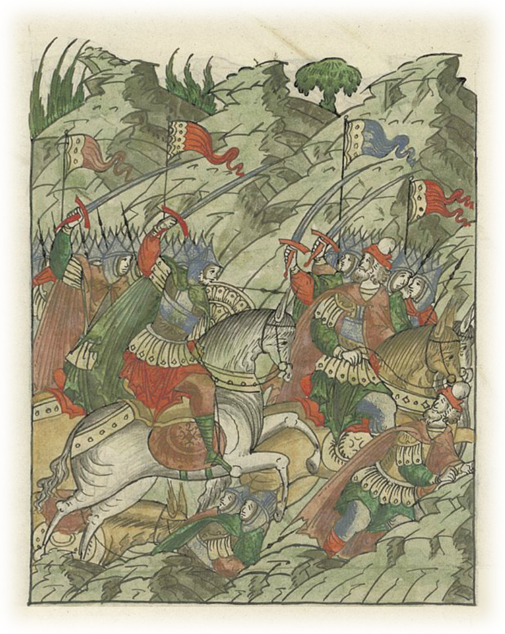Русские князья встречаются с татарским передовым отрядом на реке Калке. Князя Ивана Дмитриевича и еще двоих, бывших с ним, убивают.