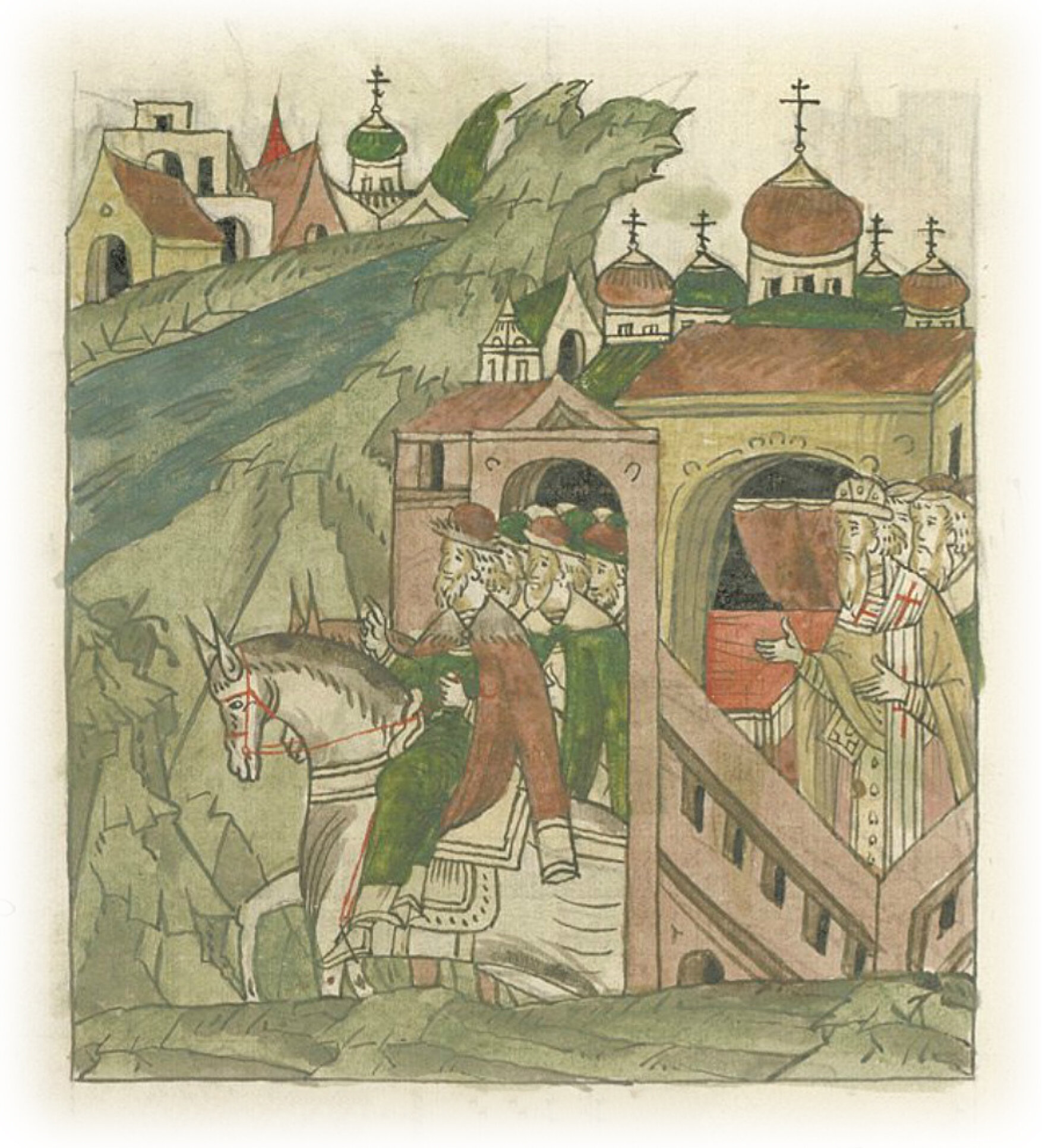 Великий князь Иван Васильевич с братьями князем Андреем Большим, князем Борисом, князем Андреем Меньшим и князем Василием Верейским по окончании литургии идет к себе на Паозерие.