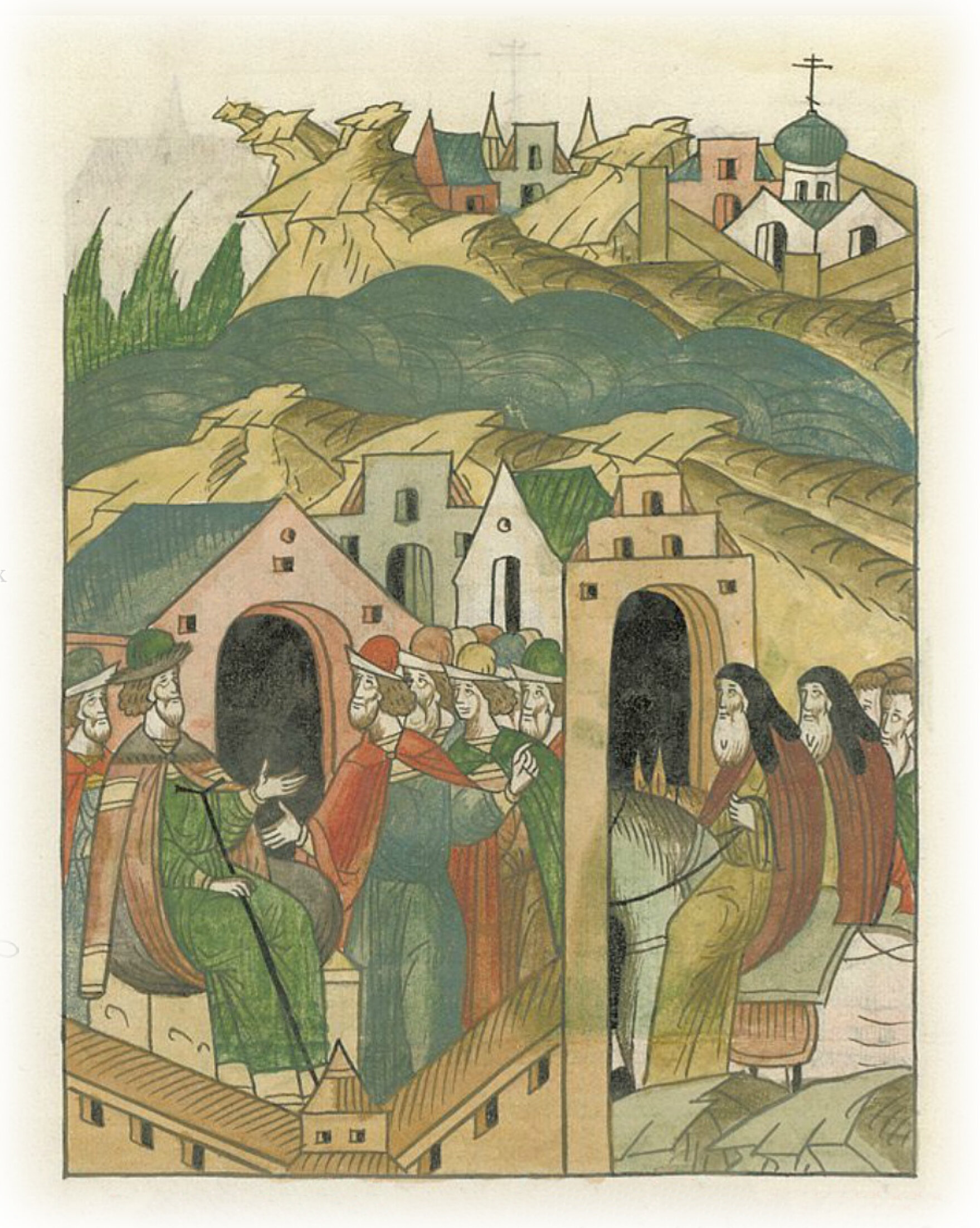 Старцы со Святой горы из Пантелеймонова монастыря архидьякон Пахомий и монах Иаков приходят за милостыней к великому князю Василию Ивановичу в Москву.