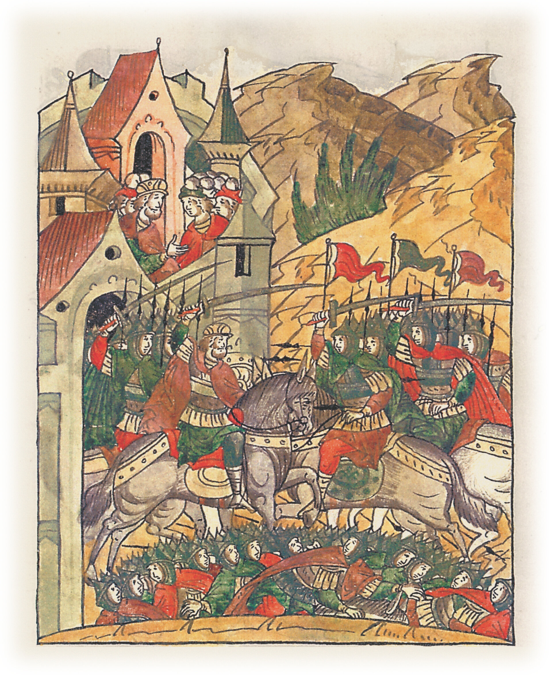 Князья же черниговские, укрепившись с горожанами и страх понемногу преодолев, выходили из города биться с ними и многих из них убили.