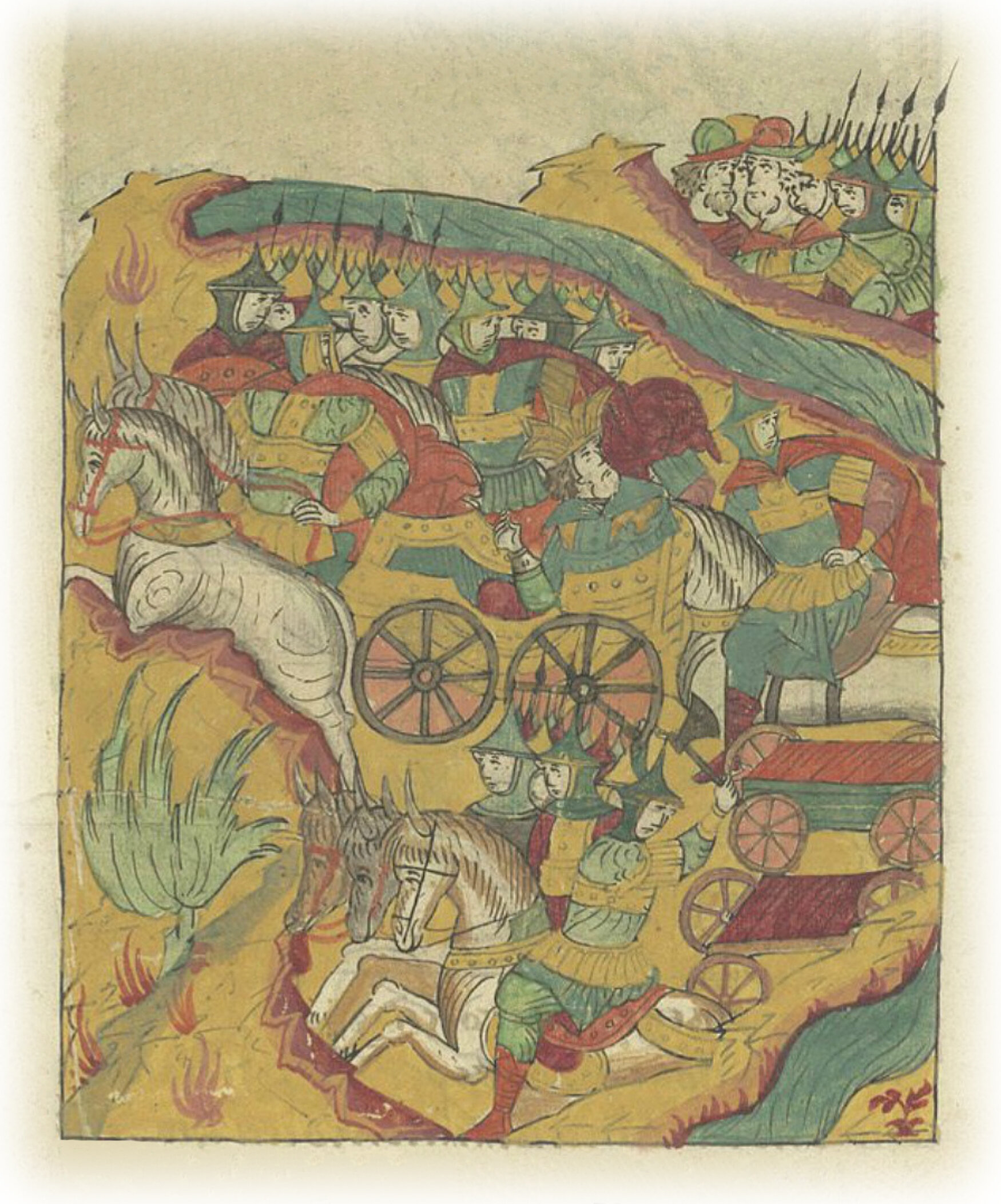 Крымский царь Саип-Гирей бежит от берега. Его везут в телеге, поскольку он был не в силах сидеть на коне.