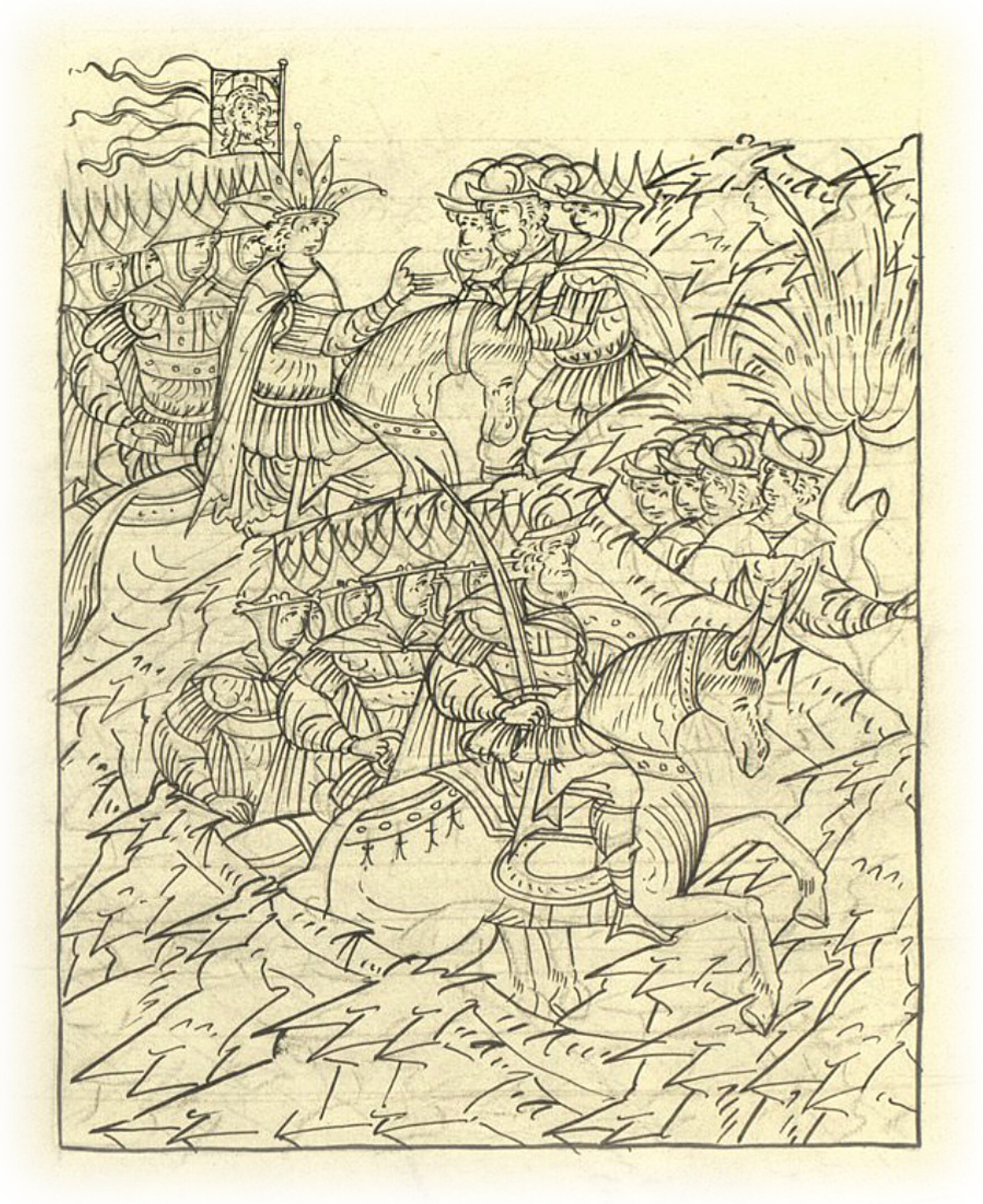Языки говорят воеводам царя Ивана Васильевича, что магистр окопался большим рвом вокруг города Рындола, бьет из пушек и пищалей и приступает к Рындолу.