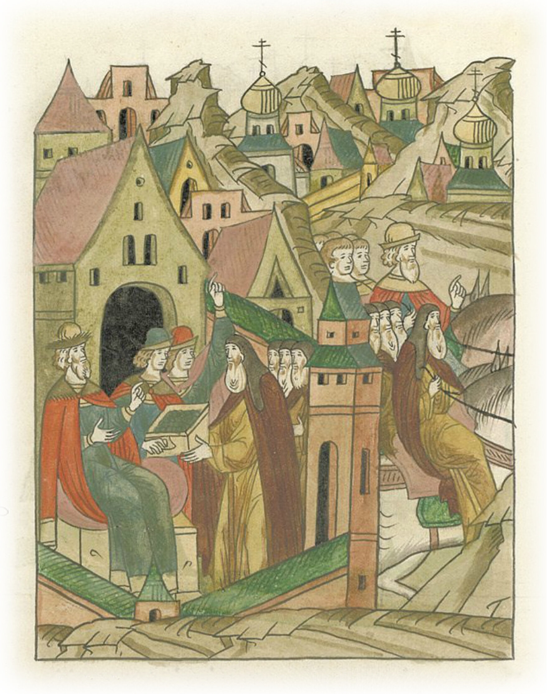 Великий князь Иван Васильевич дает милостыню игумену Паисию и старцам Святой горы и отпускает их с валашским послом Иваном Питаром.