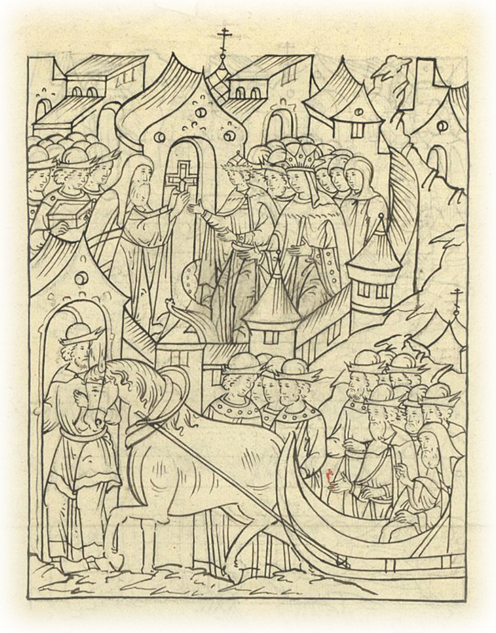 Об архиепископе. Той же зимой месяца января в 11 день приехал к великому князю Ивану Васильевичу всея Руси и к его матери великой княгине Елене из их вотчины богомолец их архиепископ Великого Новгорода и Пскова Макарий – поздравствовать великого государя Ивана Васильевича на великом государстве; благословил и челом ударил великому князю, (и подарил) крест сапфировый, золотом обложен, да шкатулку хрустальную, серебром золоченым окованную, с финифтью, и иные многие дары.