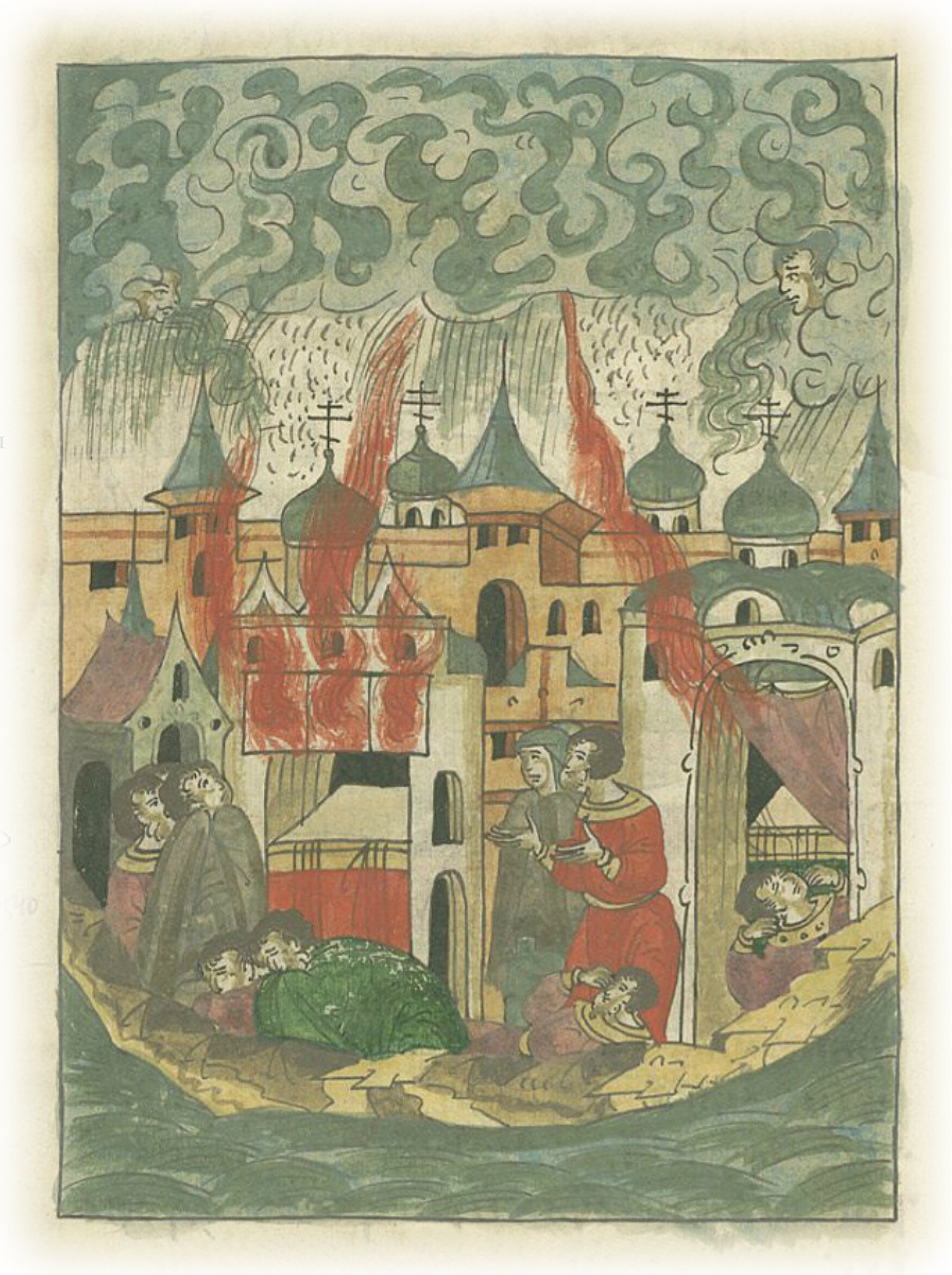 В ту же весну месяца апреля в 9 день в воскресенье после вечерни была сильная буря с ветром и темными тучами, с дождем и сильным градом, повсюду текла вода, так что людям казалось, что наступил второй потоп. И гром гремел, и молнии сверкали, земля сотрясалась, и испуганные люди замертво падали на землю. В некоторых церквях иконы были опалены молниями, даже один пономарь сгорел от небесного огня. Повсюду был сильный страх: настолько сильные были удары грома, что люди ожидали уже второго пришествия Христова! Удивительно все было: некоторые умерли от ударов грома, другие же, находившиеся в тех же местах и в тех же храмах, остались в живых. Говорится в Писании о громе и молнии: «Если от соединения облаков будет молния, то не повредит она никому, только мимо пройдет и исчезнет. Если же соприкоснется с ударяющимися друг о друга облаками, то выйдет из них небесный свет, подобный огню, соединится с молнией, спустится вниз и сожжет все, к чему прикоснется». Непонятно и трудно объяснить удары грома, все это неизреченная сила Божья! Одних устрашает, других предает смерти, некоторых ранит и возвращает от злых дел к покаянию. Устрашимся этим, вострепещем, пообещаем творить добро, бежать от лукавства, возлюбим друг друга, чтобы в настоящей и будущей жизни насладиться благом, дарованным нам Господом. Так произошло в Новгороде, чтобы изъявить произволение Божье.