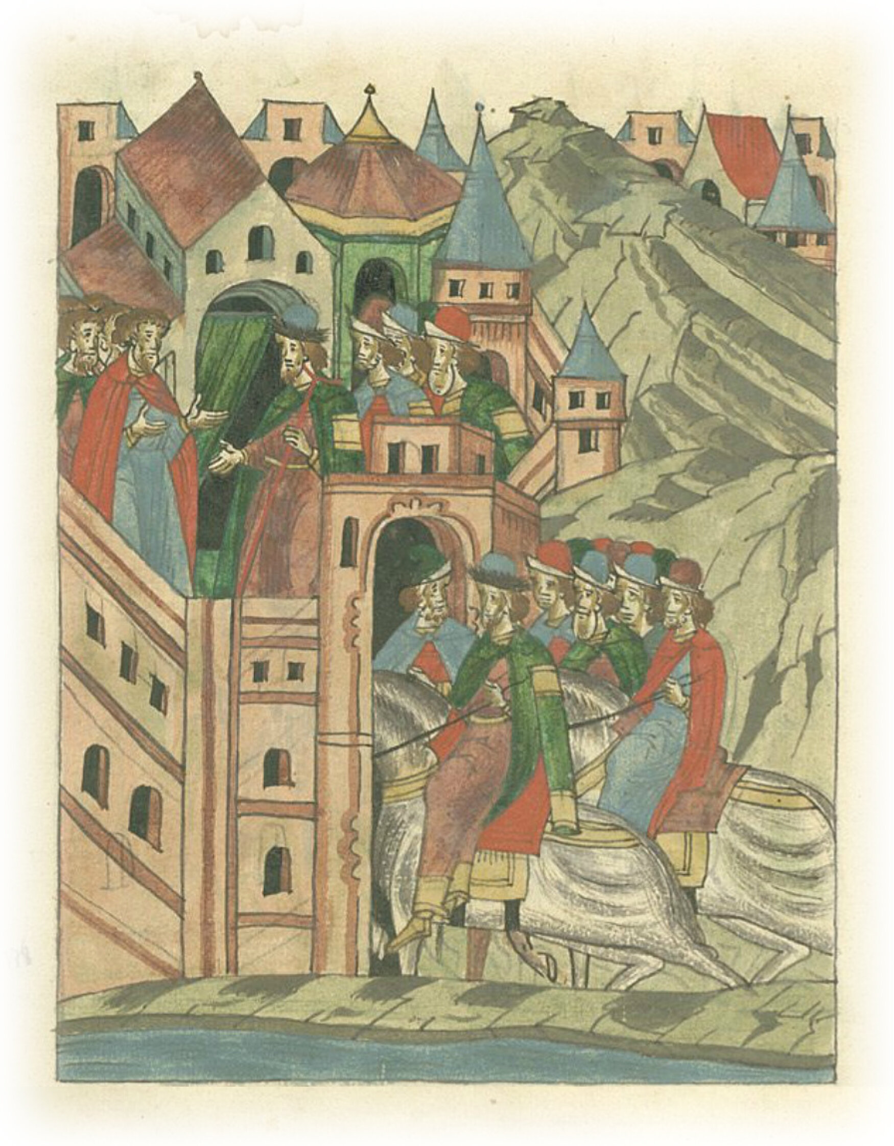 Князь Александр Михайлович Тверской с татарским послом приходит из Орды.