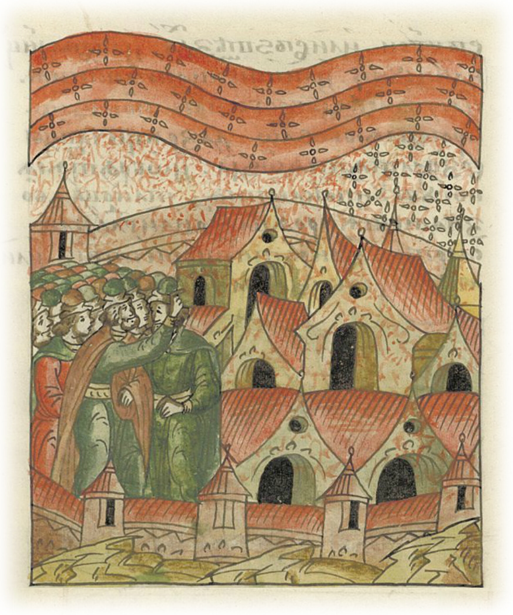 В ту же зиму было много знамений на небе; в пятый час ночи потекло все небо и стало красным, как кровь, и снег на земле и на домах напоминал разлитую кровь, и многие люди видели падение звезд на небе, и падали звезды с небес на землю, и, видя это, люди ужасались, думая, что конец мира наступает, потому что когда знамения на небе или в звездах, или на солнце, или на луне, или в чем ином являются, это всегда к добру не бывает, а к злу; ибо проявляется зло, чтобы видели люди и отвращались от зла, и обратились к Господу Богу, и покаялись. Такие знамения предсказывают или голод, или смерть, или нашествие врагов, или междоусобные войны и сражения.