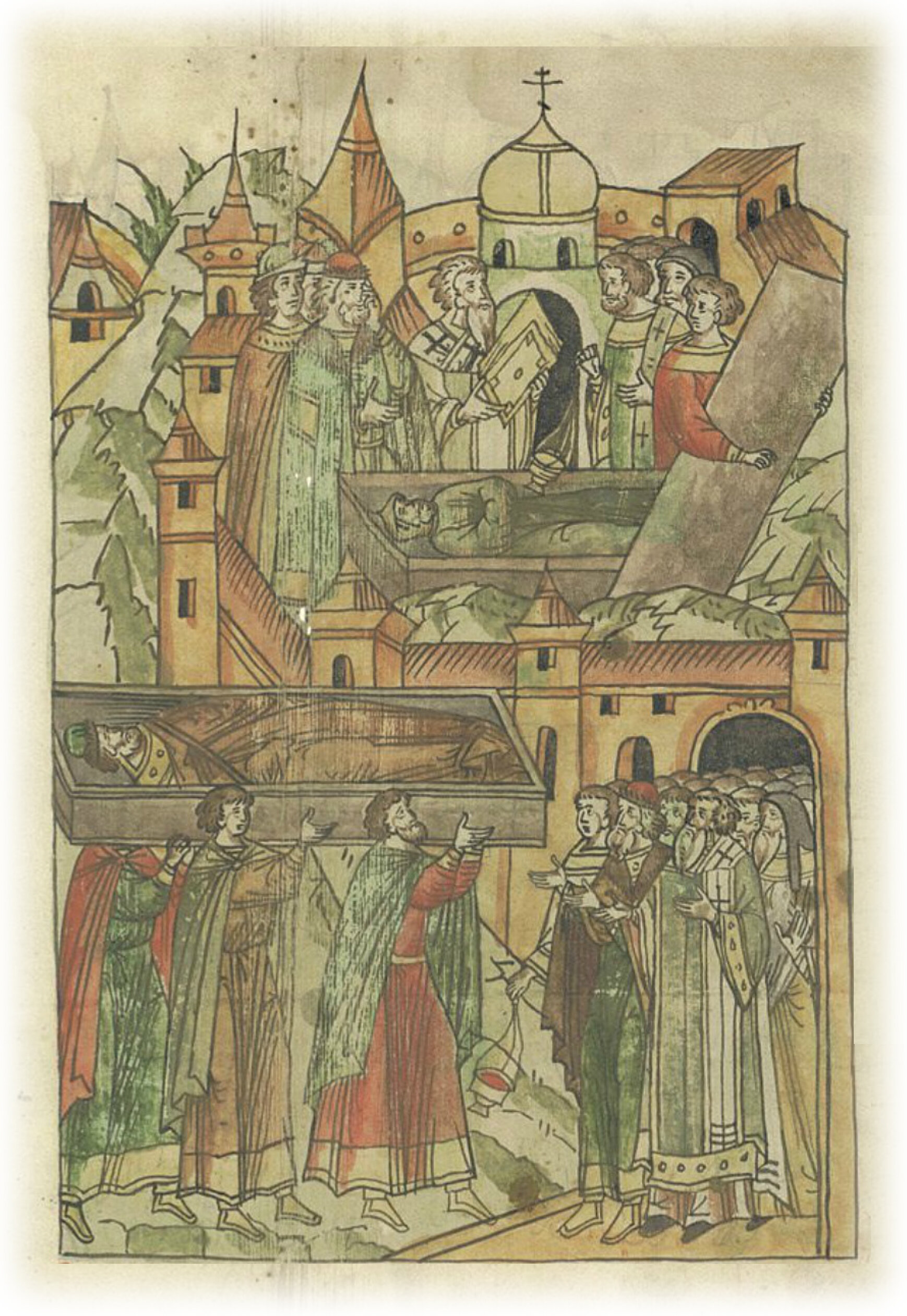 И понесли тело его* во Владимир, и встретил его брат его, князь Александр Ярославич со отцом своим, митрополитом Ки(р)иллом и со всем священным собором, (и со) всеми боярами своими, и со множеством народа, и положили его в церкви Пречистой (Богородицы) во Владимире. * речь идет о смерти князя Константина Ярославича Угличского в 1255 г. (см. ПСРЛ, т. Х).