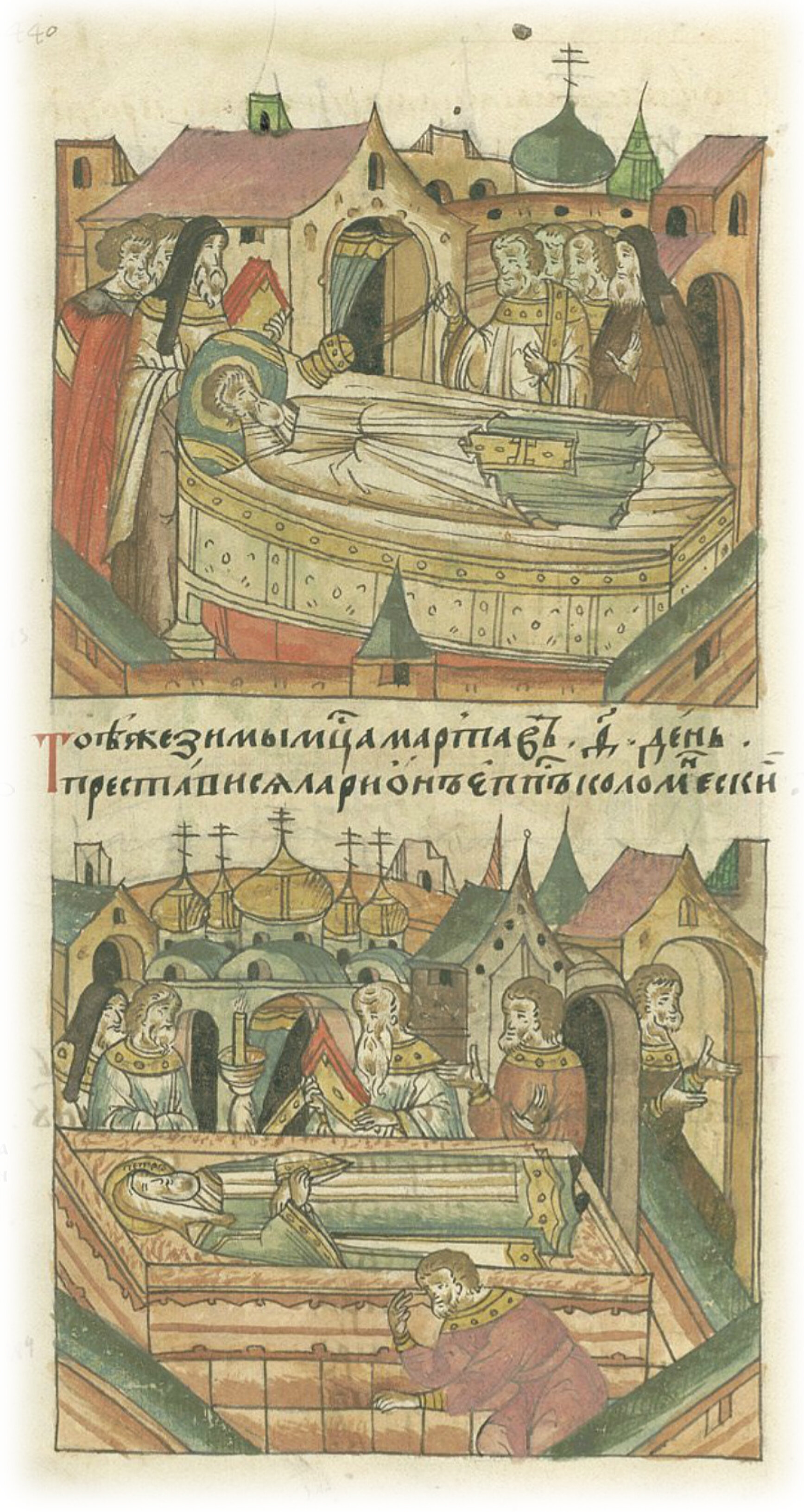 Кончина Коломенского епископа Илариона. Исцеление у гроба святого чудотворца Петра в соборной церкви в Москве.