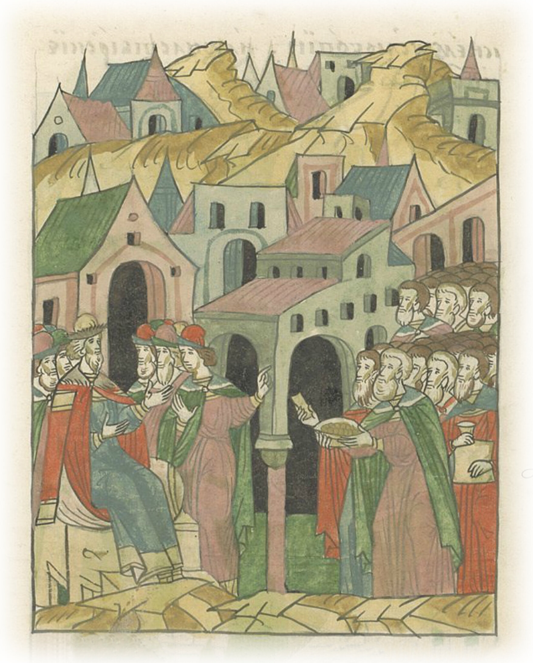 Ноября (месяца) в 24 день в пятницу, также и в прочие дни посадники и тысяцкие, и бояре, и зажиточные горожане, и судебные служки, и все пошли к великому князю челом ударить с подарками и с вином; и всякие мастера, и из всех волостей новгородских старосты и лучшие люди, иные о жалобах, а прочие – лицо его видеть; да и все без исключения обратились к нему с любовью, и монастырские, и корела.