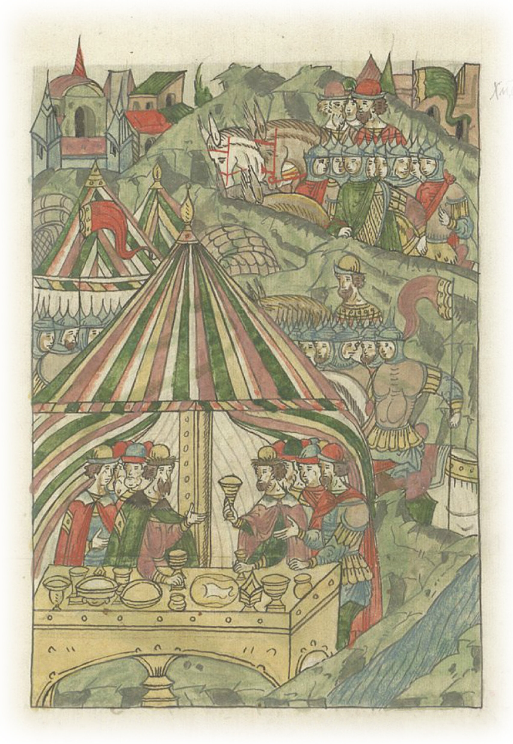 Великий князь Василий Васильевич, возвратившись в свой стан, ужинает, когда к нему приходит Алексей Игнатьевич со своим полком и другие воеводы.