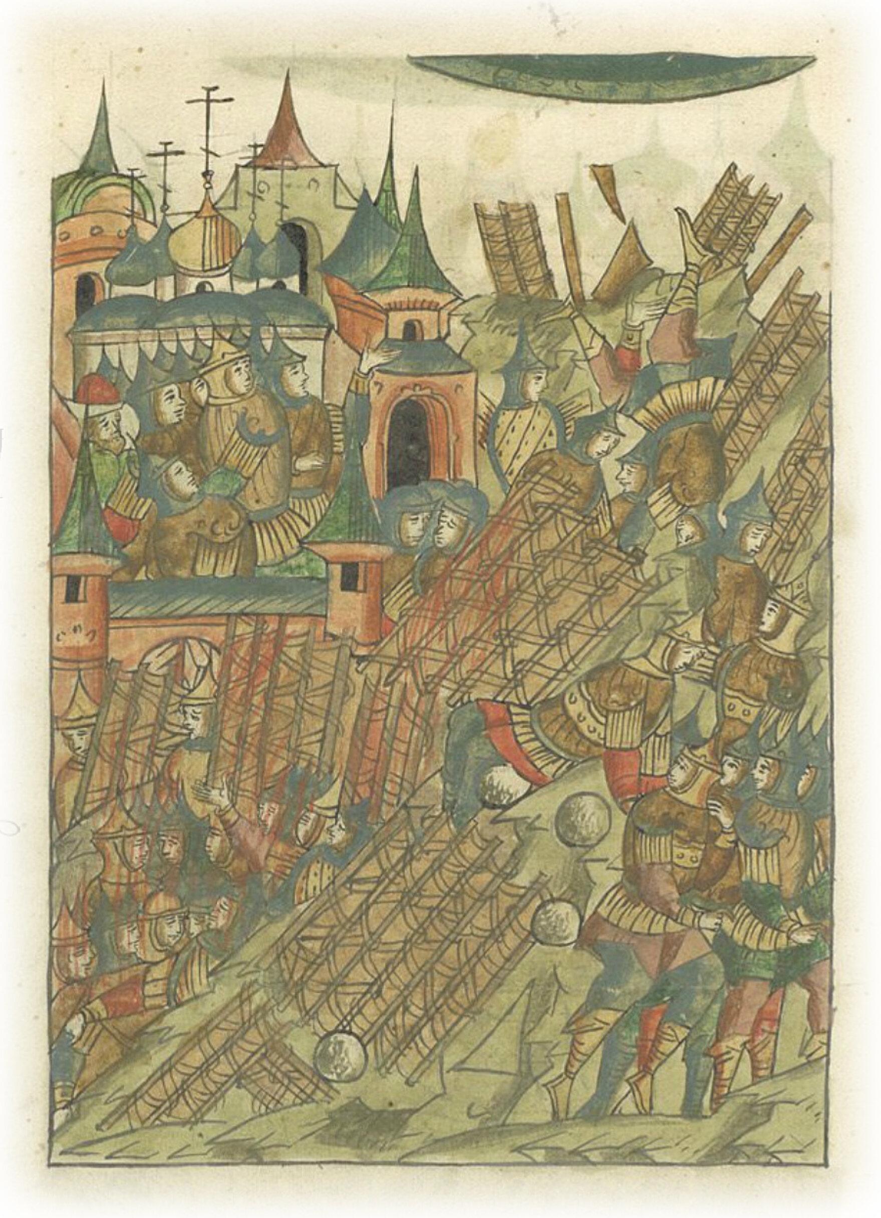 И была слышна трескотня и скрип тур, и вопль страшный, и стон людской, и обе стороны бежали: горожане со стен в город, а турки дальше от города; и падали с высоты люди и деревья, одни в город, а иные в рать, и наполнились рвы турками.