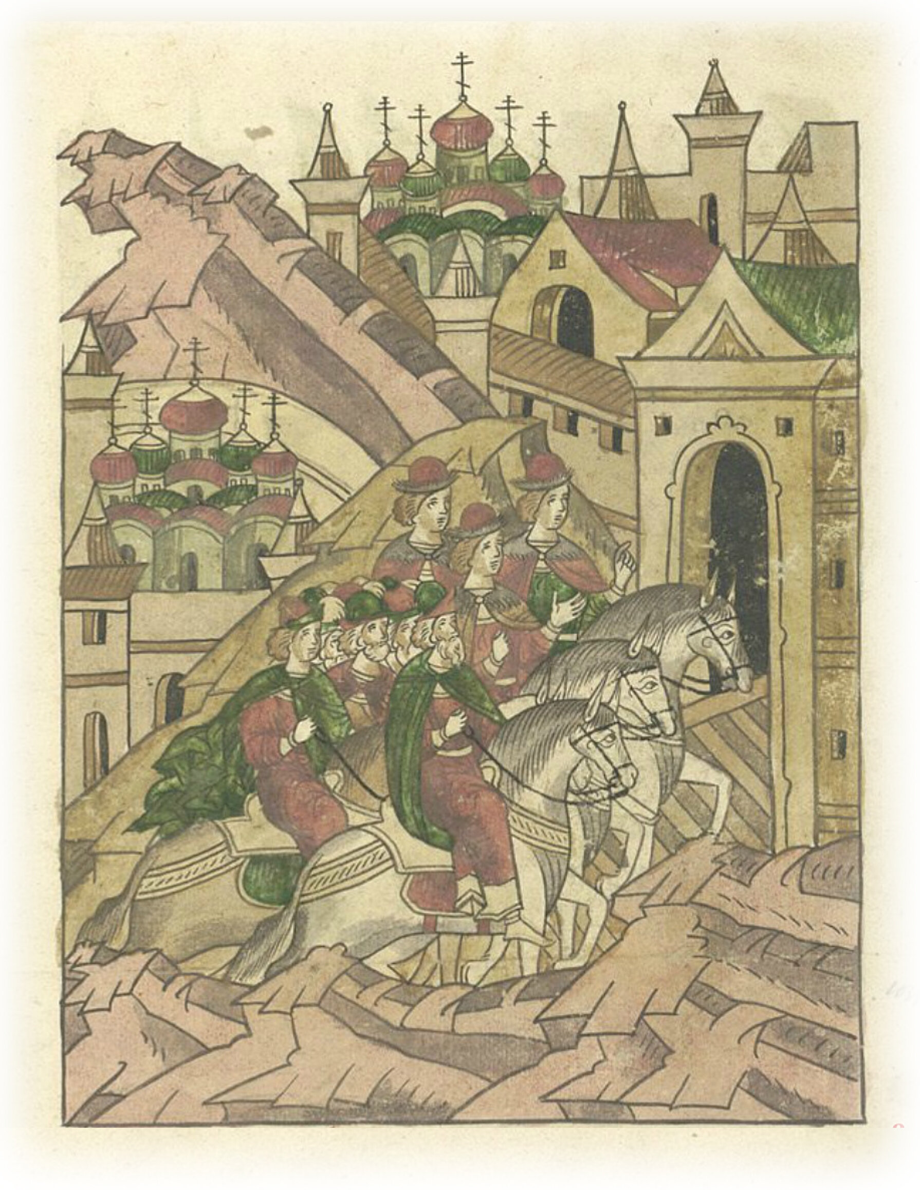Великий князь Дмитрий Иванович с братом Иваном Ивановичем и двоюродным братом Владимиром Андреевичем идет из Москвы во Владимир.