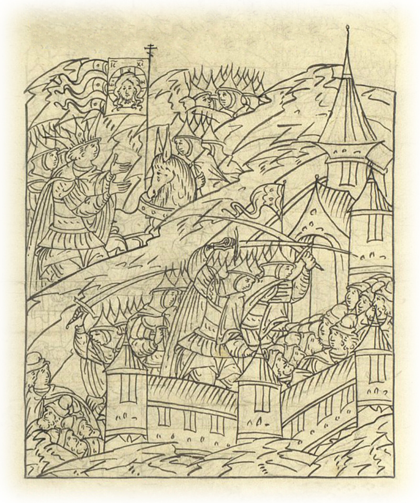 Языки говорят воеводам царя Ивана Васильевича, что магистр окопался большим рвом вокруг города Рындола, бьет из пушек и пищалей и приступает к Рындолу.