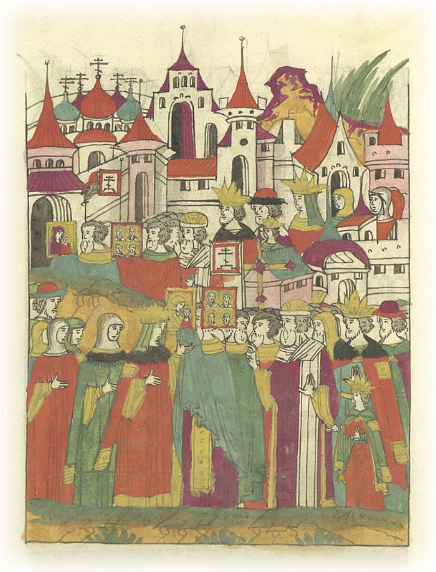 И встретила за городом за Ризположенскими воротами чудотворные образы царица и великая княгиня Анастасия, а с нею (супруга) князя Юрия Васильевича княгиня Ульяна, а с ними множество боярынь; и осенив себя крестом у образов Пречистой Богоматери и великих чудотворцев и любезно приложившись ко всем иконам и крестам честным, и приняв благословение у митрополита, пошли за образами вместе с царем и митрополитом в город