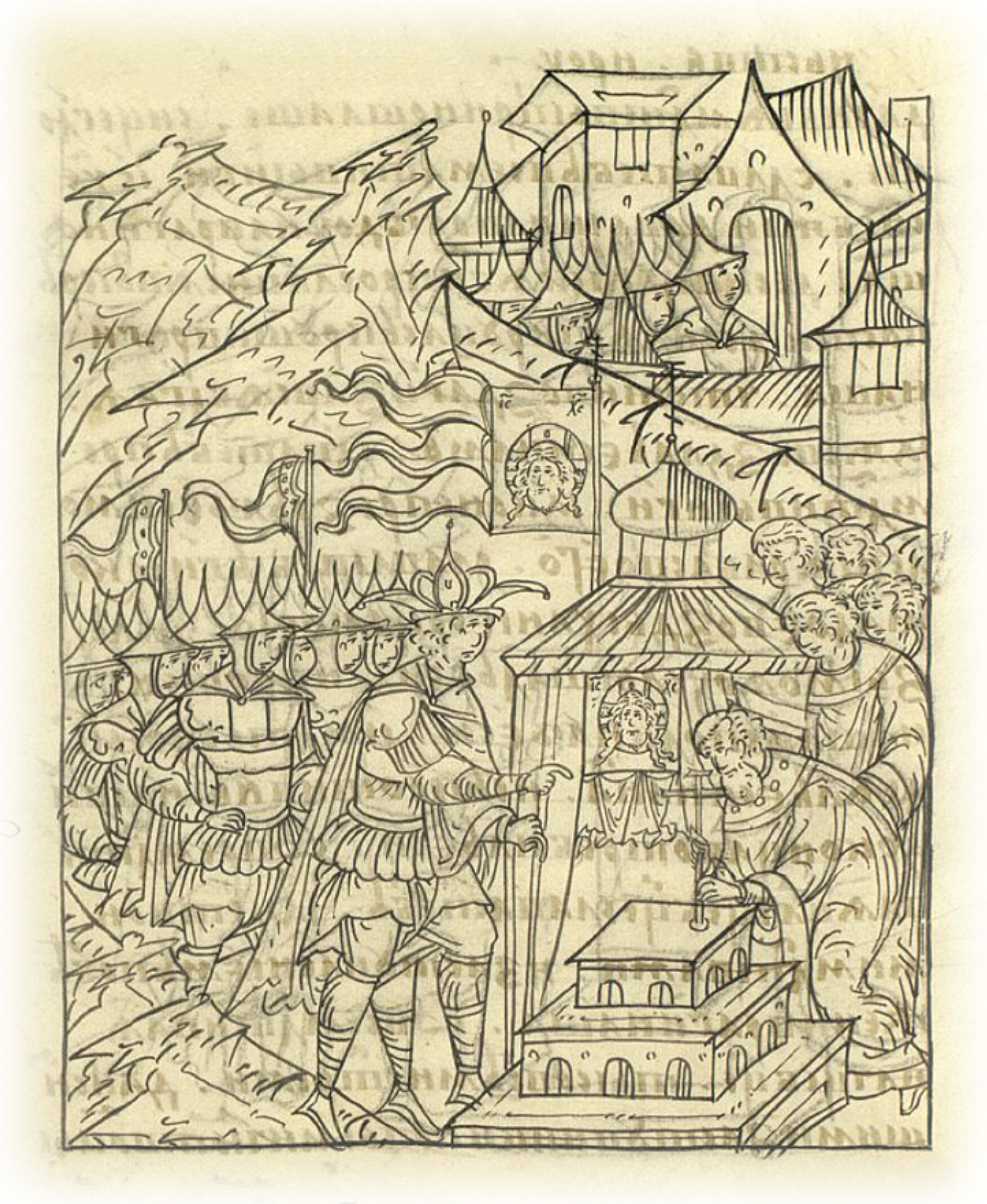 И повелел благочестивый царь и великий князь в своем полку, под своим знаменем, молебен петь (после обеденного часа)*, благодарение Богу воздавая; и тотчас повелел животворящий крест поставить своими руками с протопопом и церковь поставить (во имя) Нерукотворного образа Господа нашего Исуса Христа на месте, где знамя царское стояло во время взятия города. * редакторская правка скорописью.