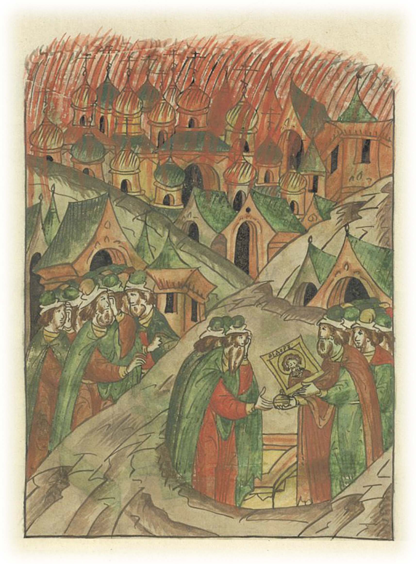 В том же году погорел город Ростов почти весь, церквей 15 сгорело, а также на епископском дворе церковь Иоанна Предтечи вся до основания сгорела, осталась посреди огня только икона святого великомученика Феодора Тирона и вощаница с вином, о которой говорили, что принадлежала Леонтию епископу, прежде бывшему в Ростове.