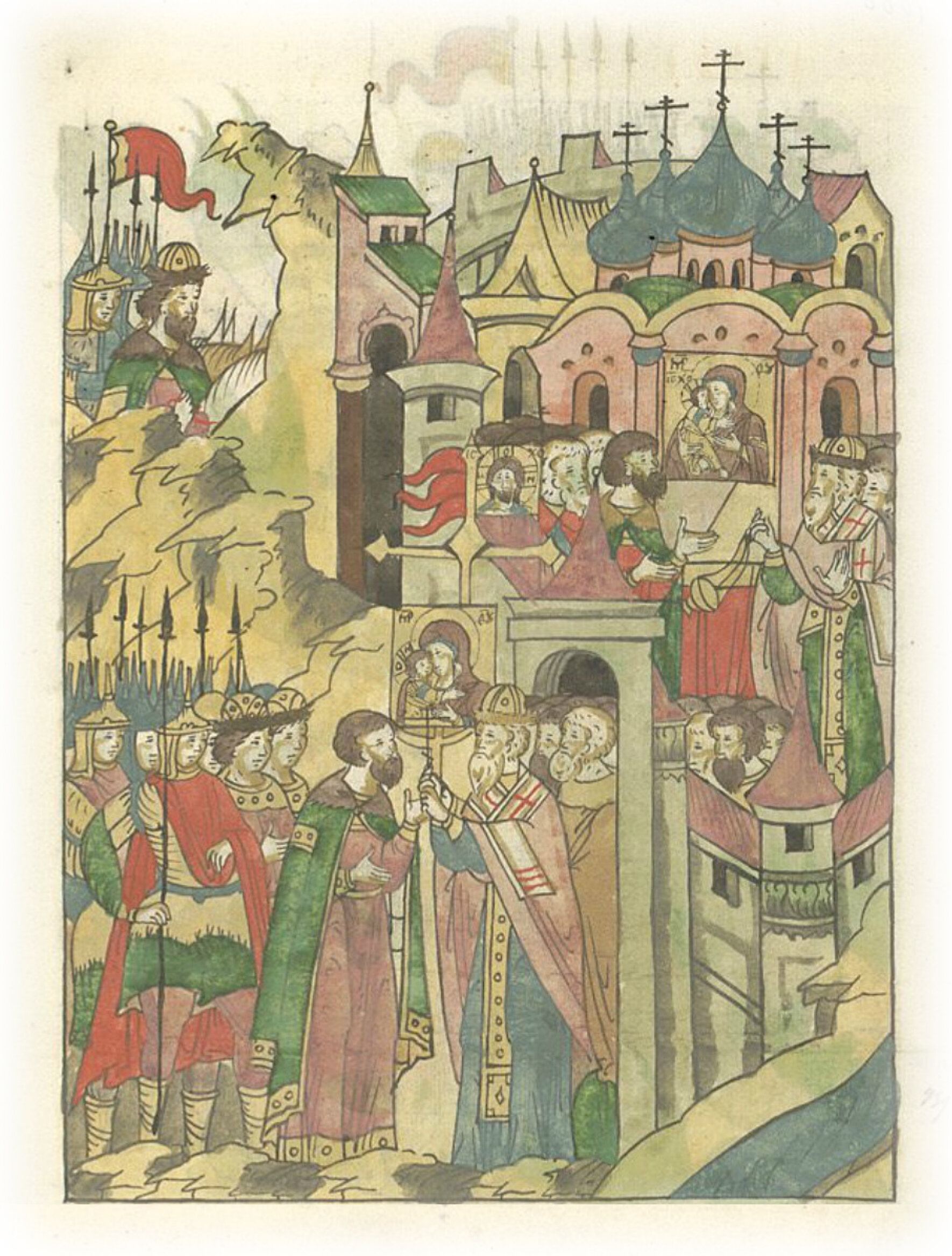 и пришел в город Коломну. Епископ этого города встретил великого государя с крестами в воротах города. И великий князь совершил молебен в соборной церкви.