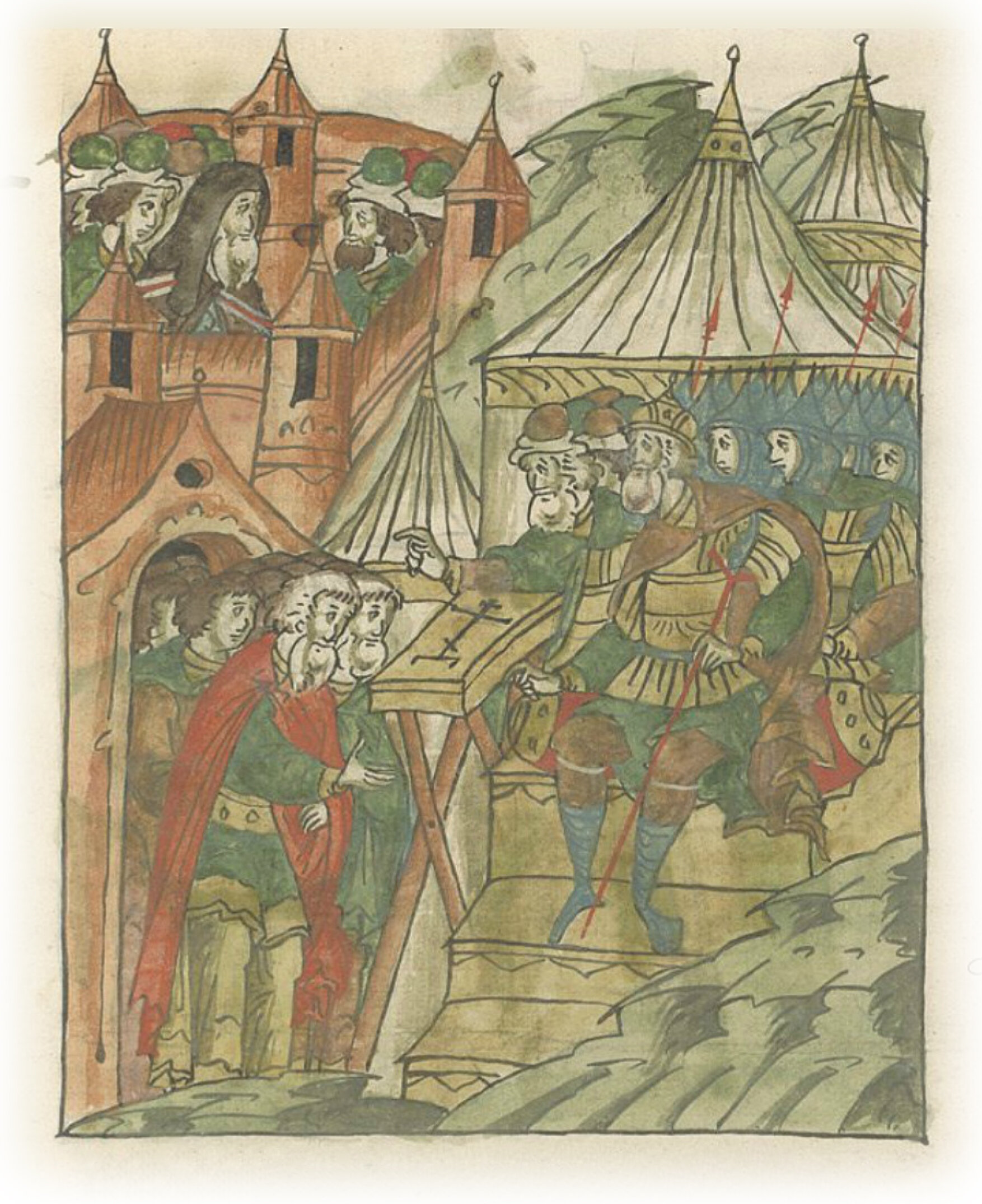 Июля (месяца) в 31 день смоленские князья и бояре город отворили, а сами пошли к шатрам бить челом великому государю и предстать пред его очи, да тут и присягнули великому князю, и крест целовали. И великий князь их простил, и слово свое жалованное им молвил, и пировать их позвал.