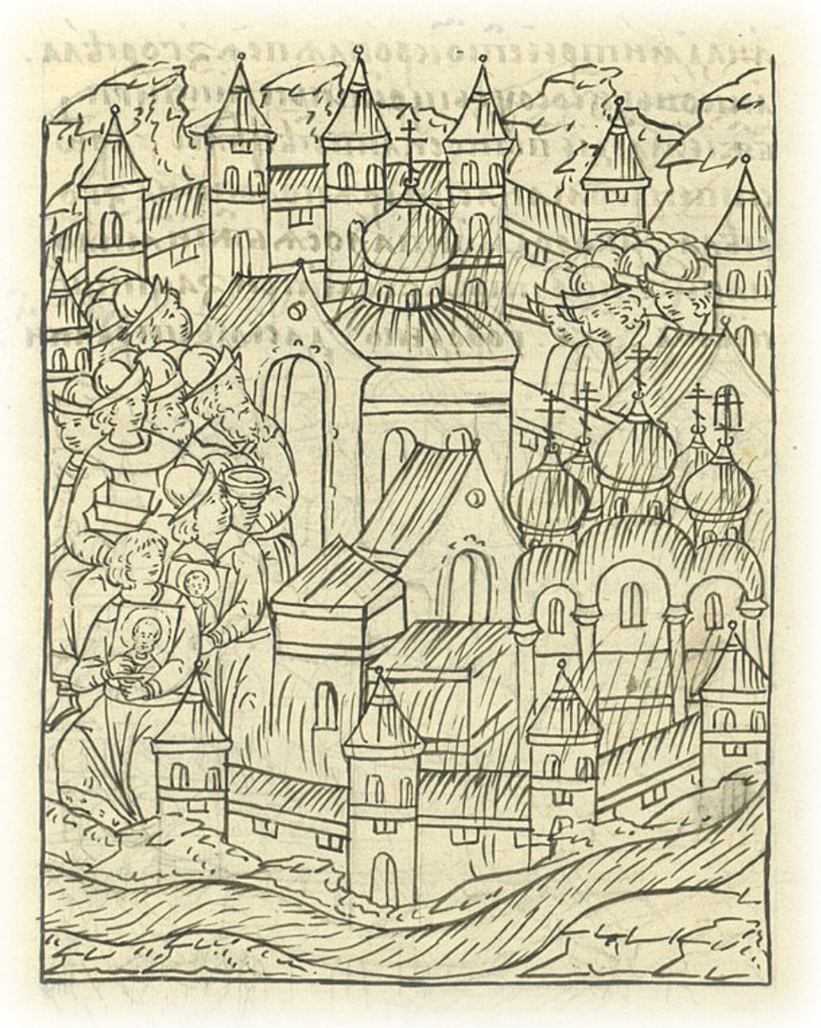 О Владимире. В том же месяце апреле в 13 день, в четверг седьмой недели святого Поста на девятом часу дня, загорелся город Владимир между Рождественским монастырем и Андреевскими воротами на пустом месте, и сгорела стена от реки Клязьмы, и разметало 170 городен да четыре башни, да на соборной церкви Пречистой Богородицы половина кровли сгорела, а на церкви Дмитрия святого кровля вся сгорела, а иконы и сосуды церковные, и книги Божием милосердием вынесли все целы, а Рождественского монастыря половина сгорела, а от города осталось Божиим помилованием и Пречистой Его Матери защищением 265 городен да семь башен.