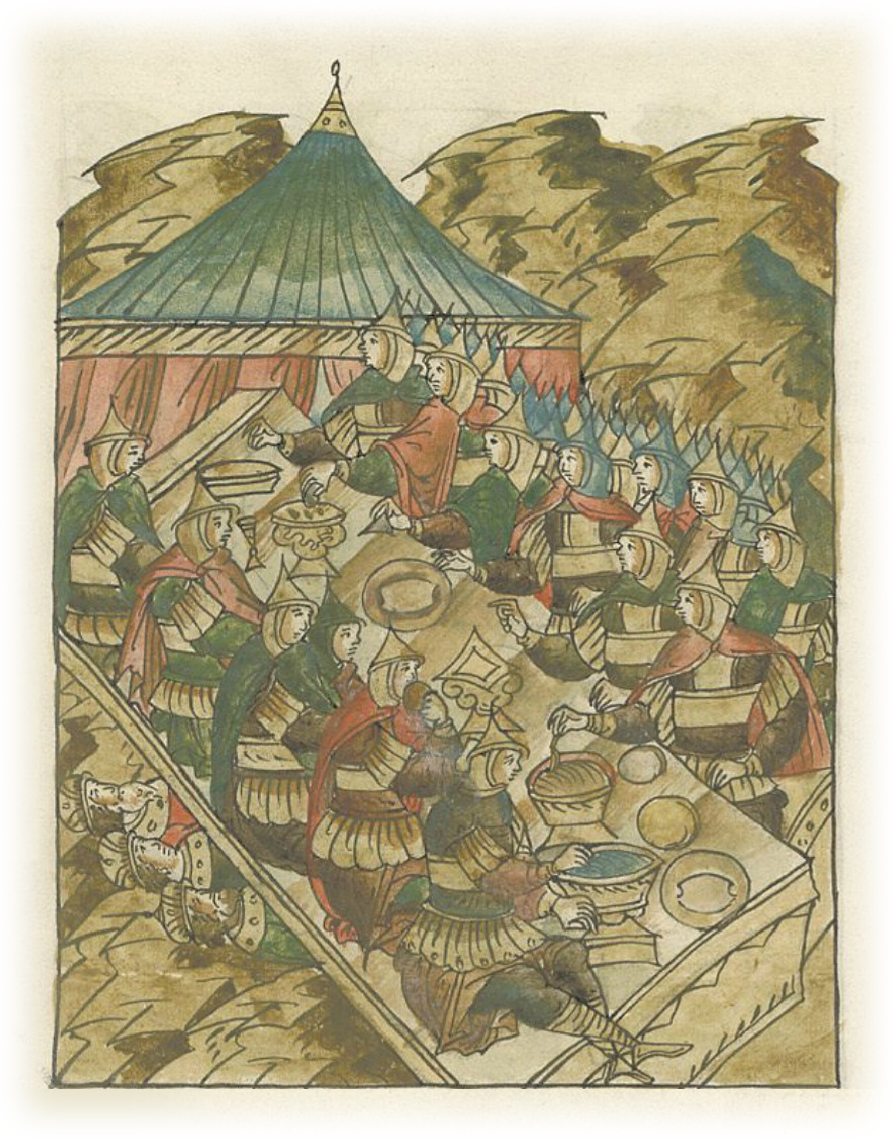Татары, взяв острог великого Киевского князя Мстислава Романовича и бывших с ним, иссекают всех людей, кладут князей под доски и садятся на них сверху обедать. Князья задыхаются.