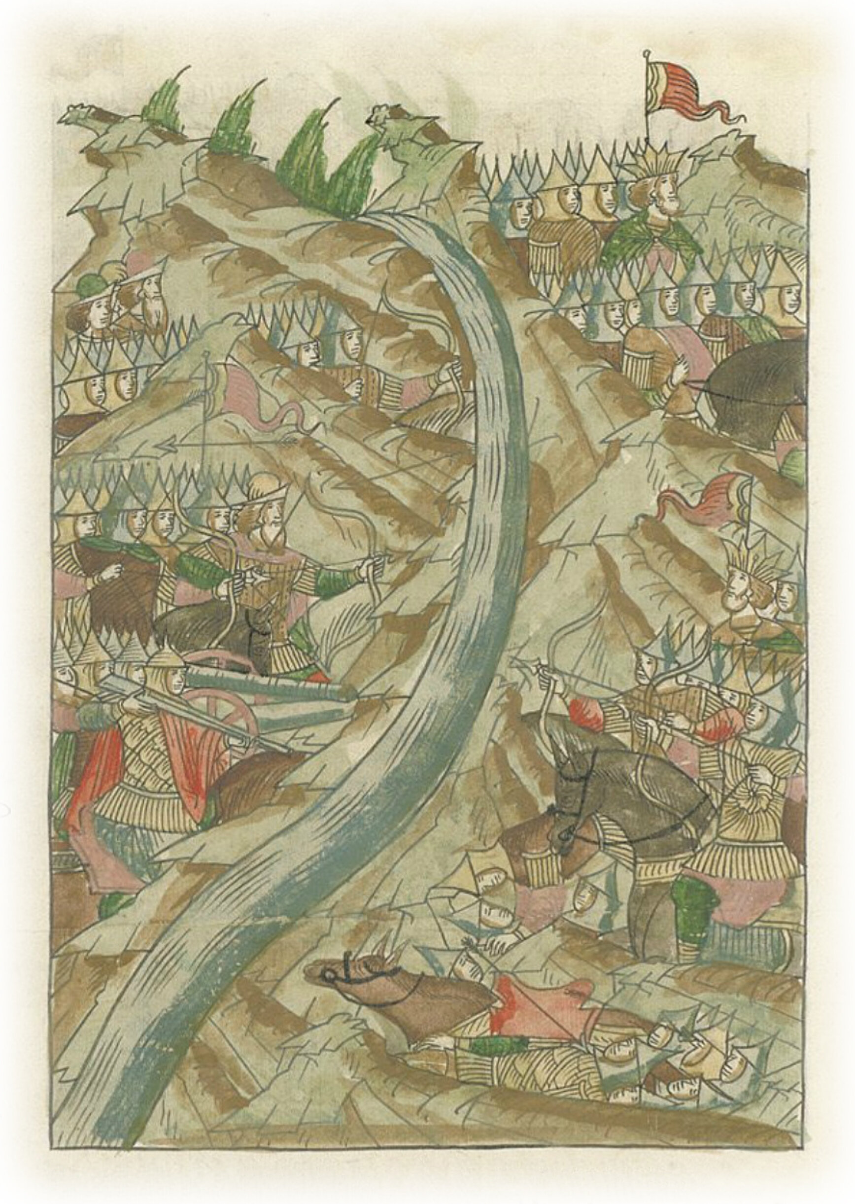 А наши стрелами и пищалями многих побили, а их стрелы между наших падали и никого не ранили; и отбили их от берега.
