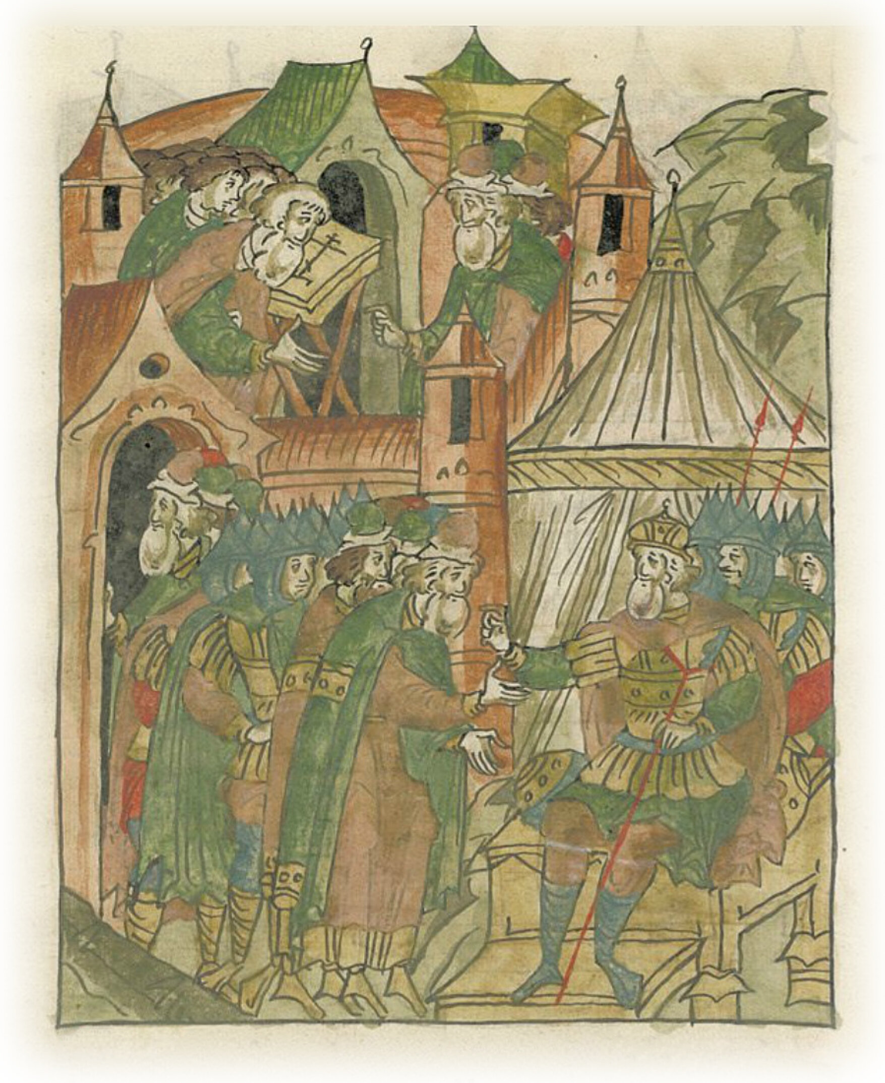 И послал в город Смоленск боярина своего и воеводу князя Данила Василиевича Щеню и иных своих воевод со многими людьми, повелев им прочих людей: князей, бояр, мещан и всех людей города Смоленска к присяге привести и речь им государскую жалованную говорить.