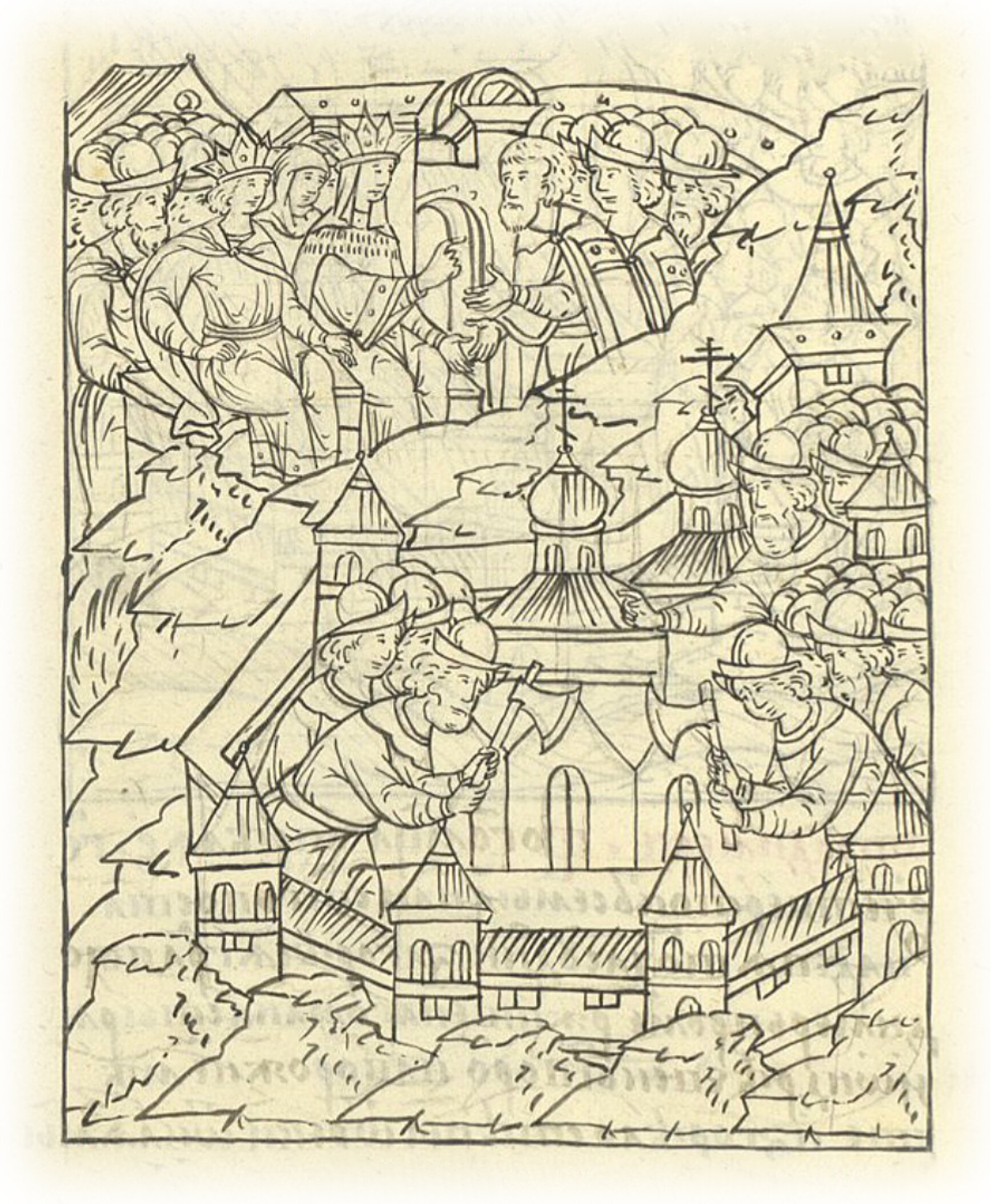 И князь великий Иван Василиевич всея Руси, и мать его великая княгиня Елена велели в городе Владимире то место срубить, и где будут оставшиеся стены, починить; и в том же месяце в 19 день послан город делать Истома Курцов. И в том же году, в августе, доделан город Владимир в третье лето государства его.