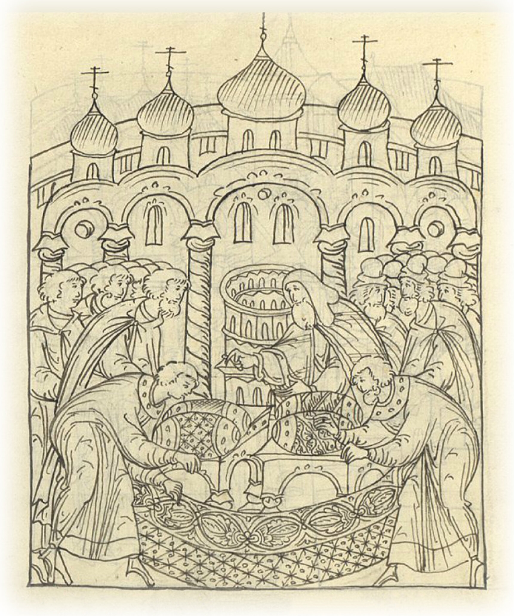 И поставили посреди церкви место великому князю, на каком святителей ставят, и на нем 2 стула, украшенных золотыми шелковыми тканями и с сажеными подушками, а в его подножии постелили бархаты и камки.