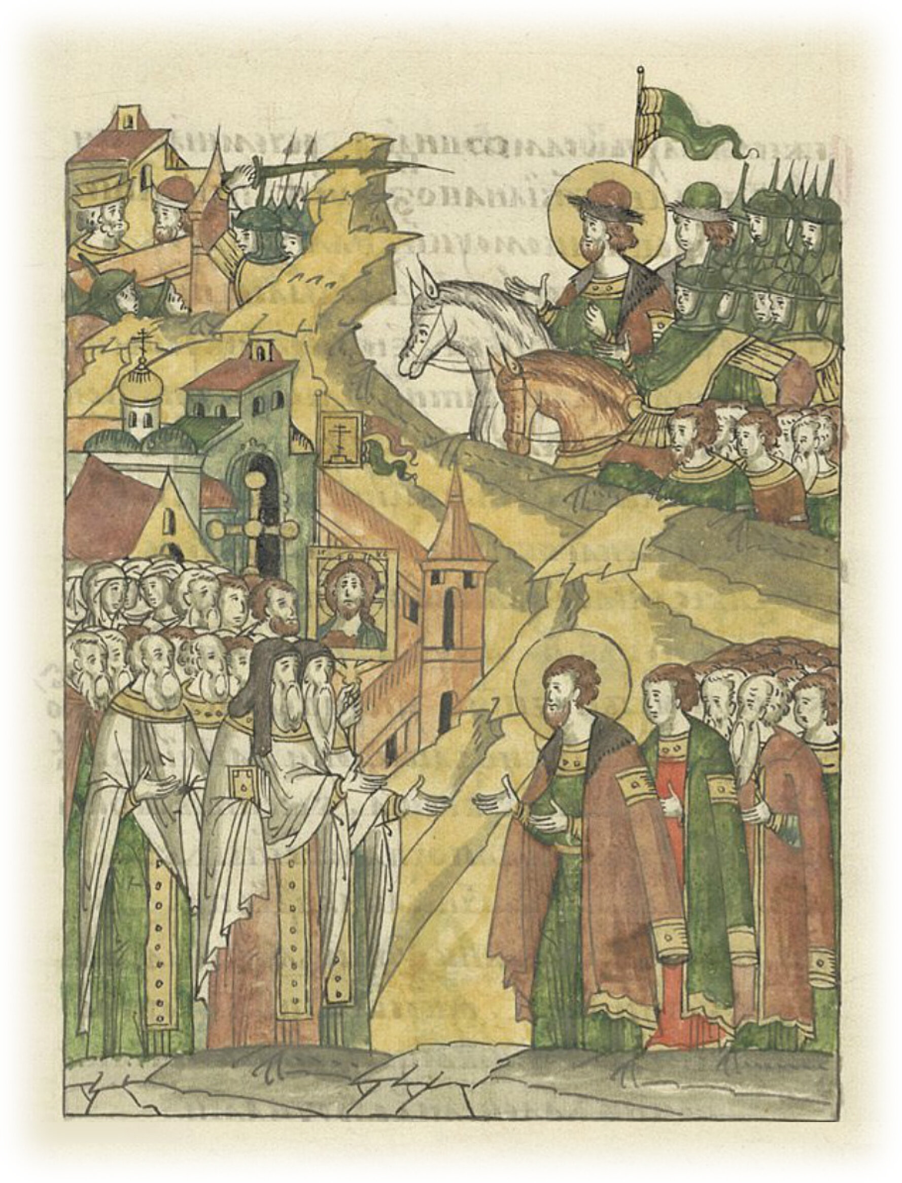 Великий князь Александр Ярославич возвращается с победой над немцами на Чудском озере. У Пскова ему навстречу выходят игумены, попы и множество народу и благодарят его за освобождение их города.