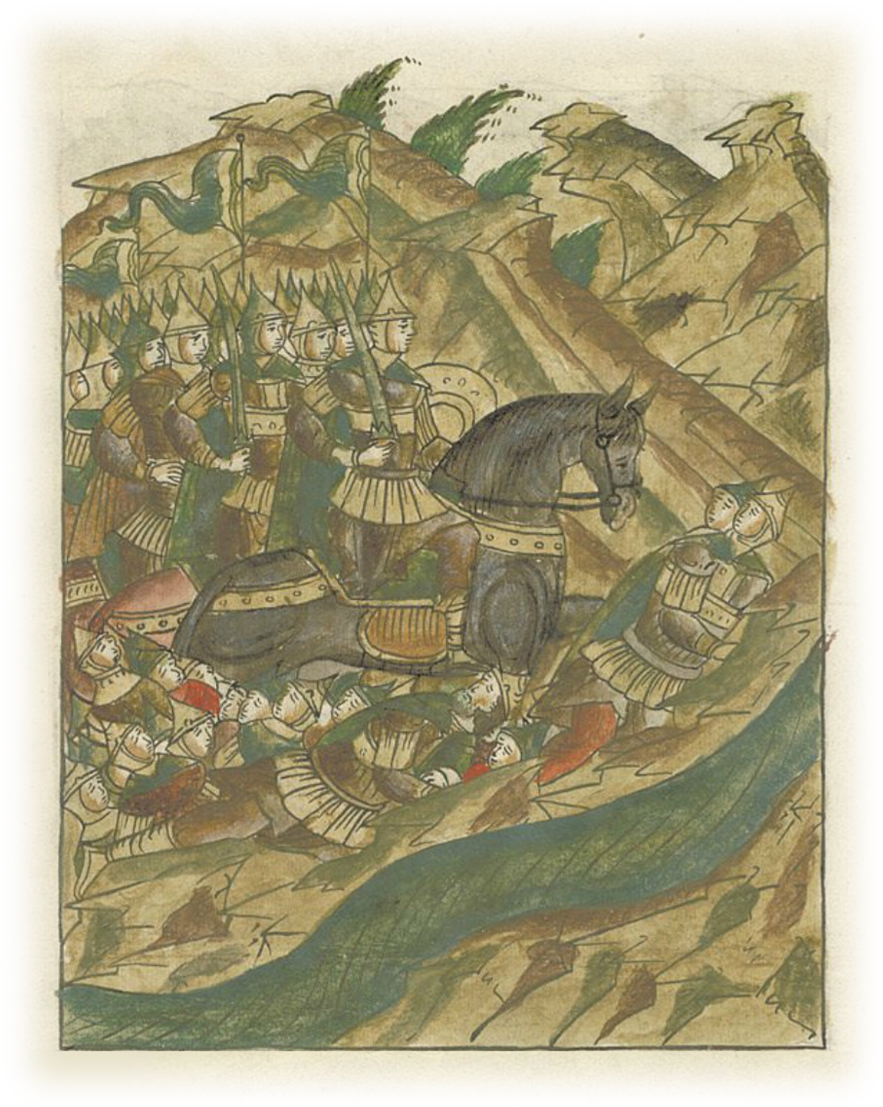 Воеводы царя Ивана Васильевича, разделившись, идут в погоню за царем Емгурчеем.