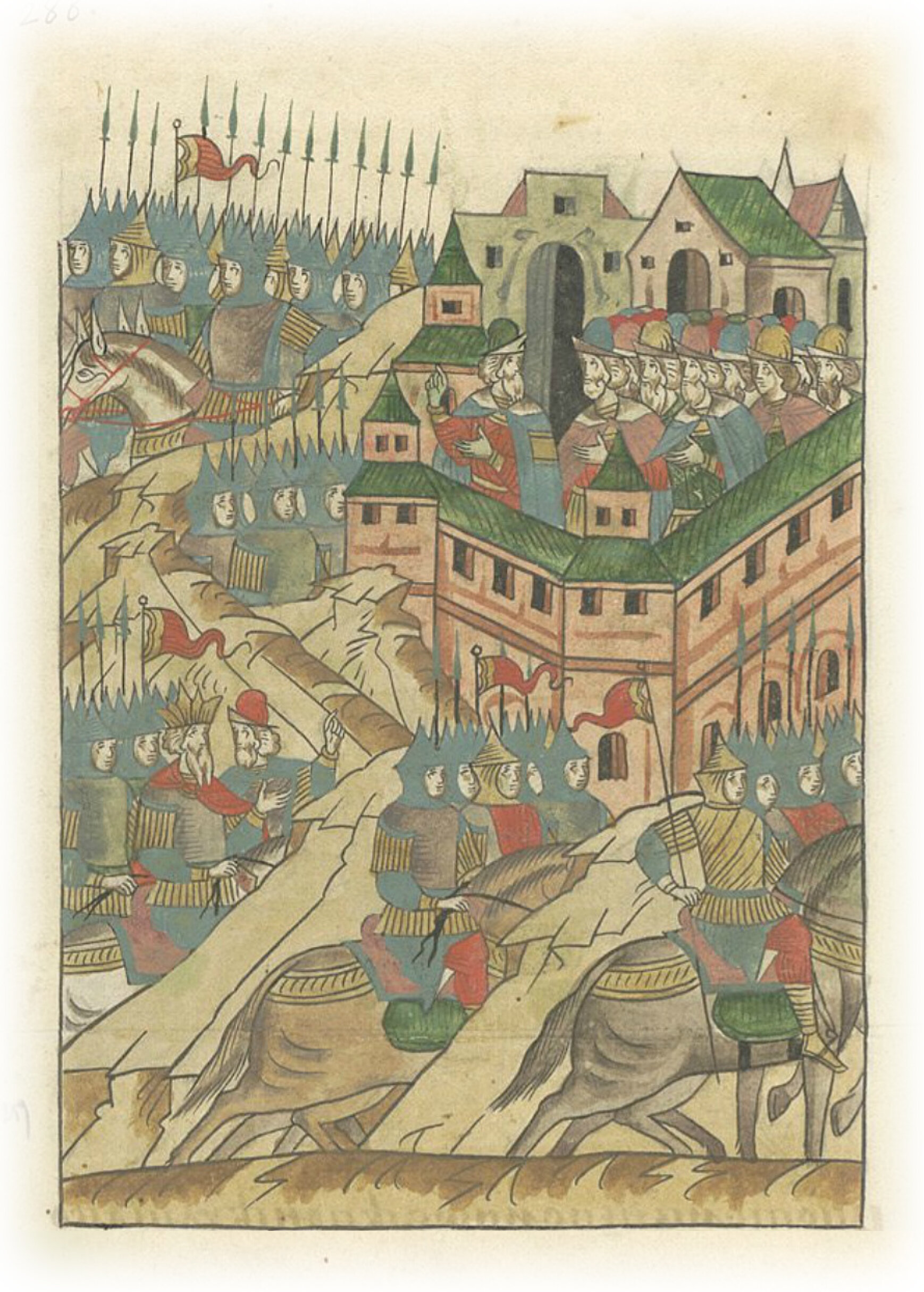 Татары же вокруг всего города объехали, осматривая его, и отошли; было же около города чисто, потому что горожане сами посады свои пожгли и ни единого тына или дерева не оставили, опасаясь незаметного подхода к городу.