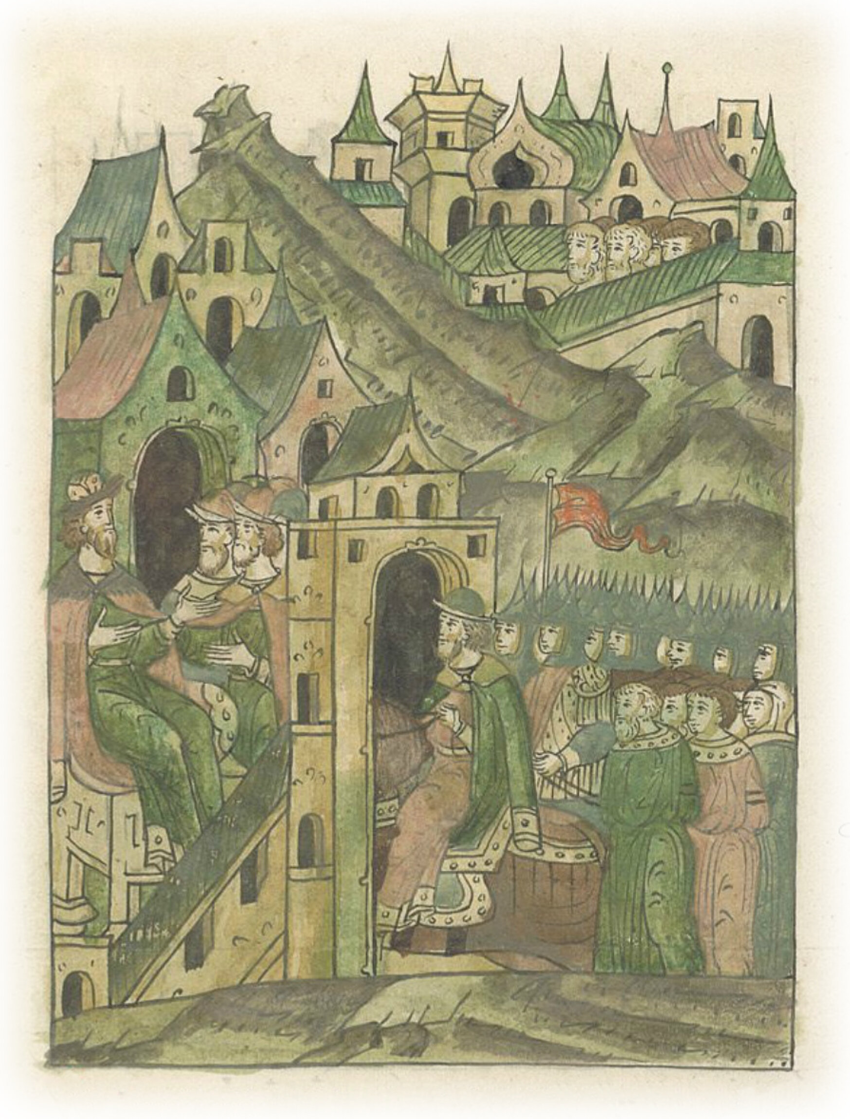 Ругодивские посадники Яким и Захар приезжают в Москву. Воеводы царя Ивана Васильевича Алексей Адашев и Иван Михайлов сообщают им, что государь пожалует их, если сдадут его воеводам помимо Ругодива Вышгород.