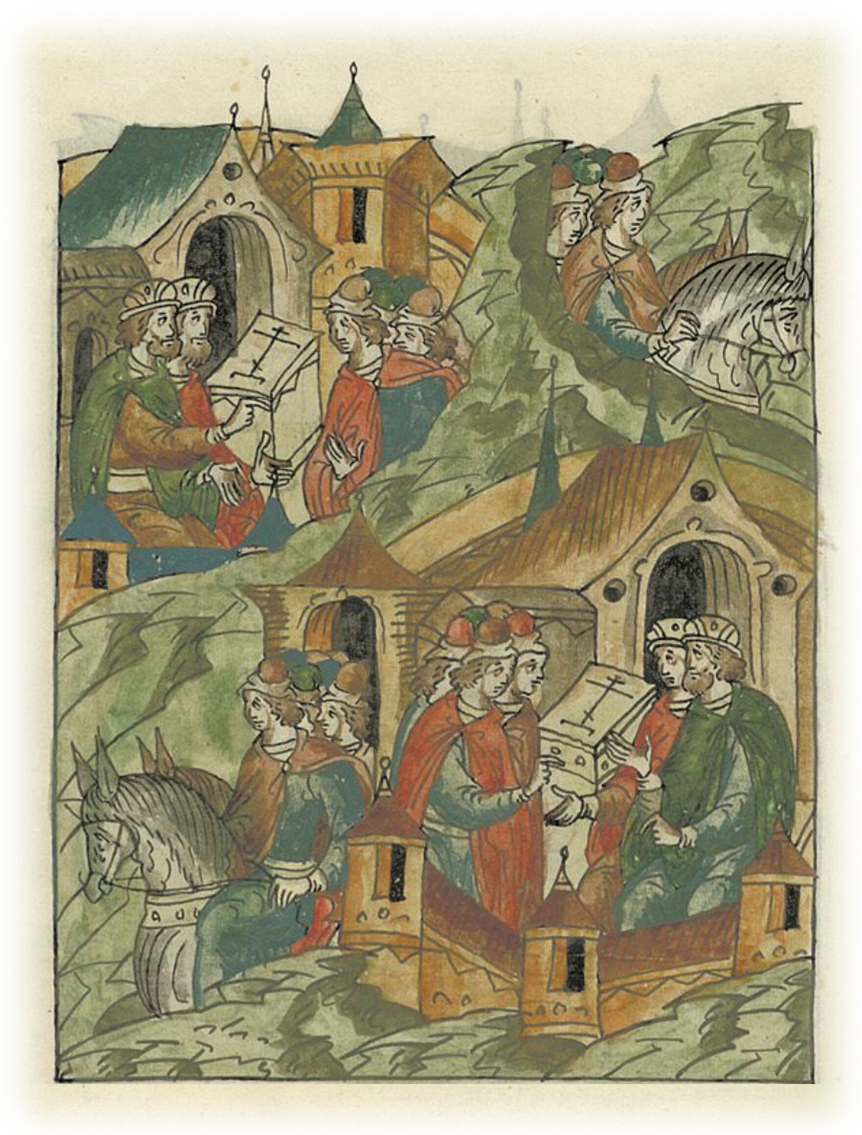 В 6711 (1203) году. Князь великий Владимирский Всеволод, сын Юрия Долгорукого, и великий князь Галичский Роман Мстиславич вместе с черниговскими князьями Олеговичами договорились и заключили между собой мирный договор, и на кресте принесли клятву пребывать в единстве.