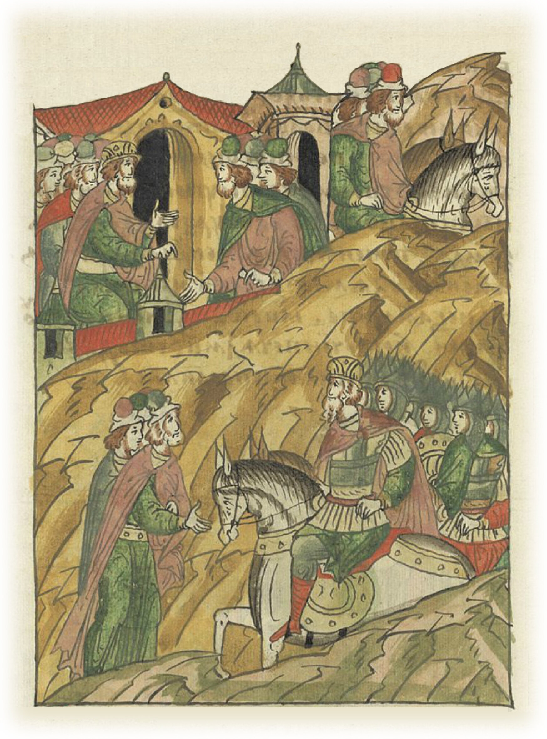 Ругодивские посадники Яким и Захар приезжают в Москву. Воеводы царя Ивана Васильевича Алексей Адашев и Иван Михайлов сообщают им, что государь пожалует их, если сдадут его воеводам помимо Ругодива Вышгород.