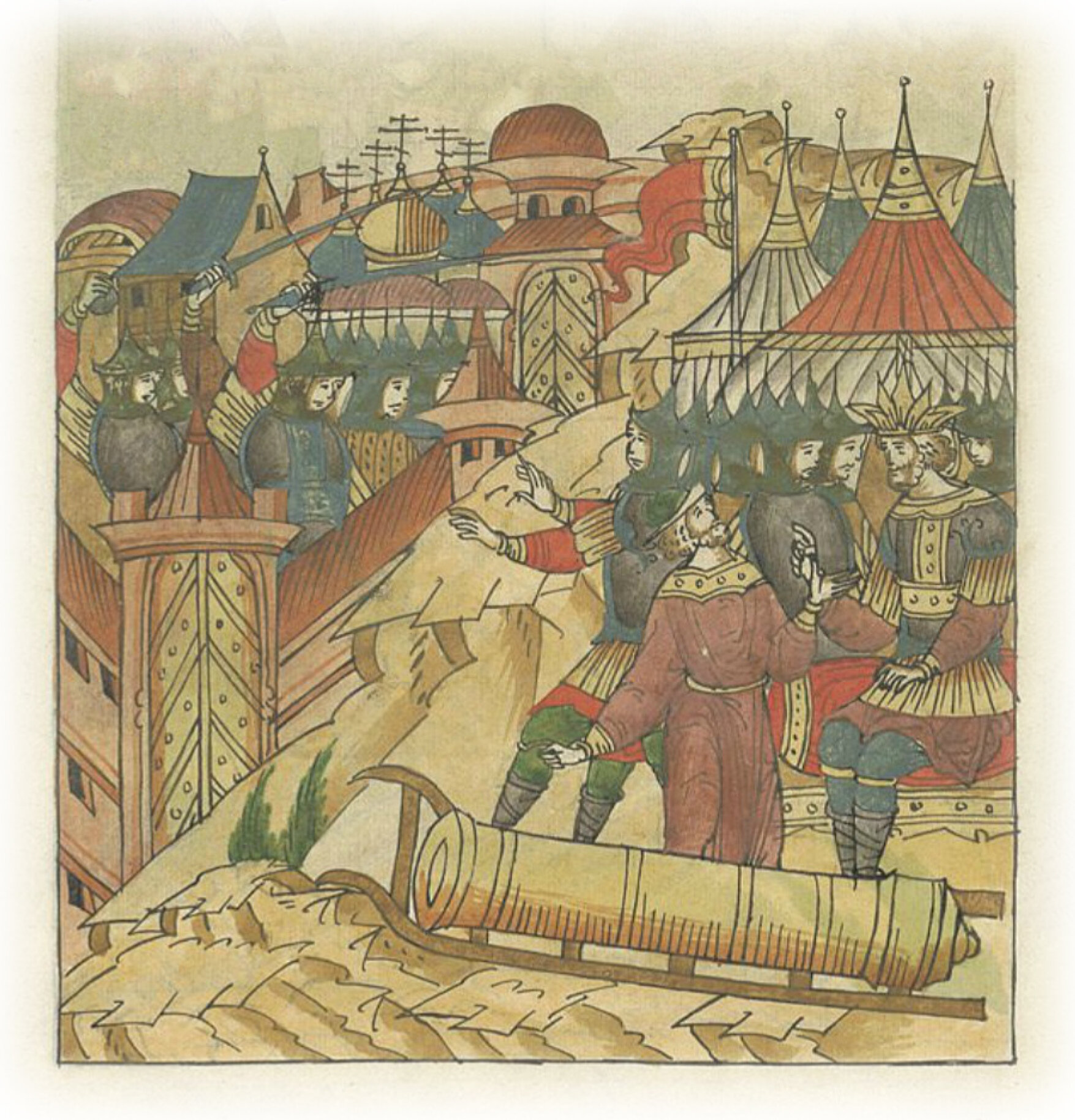 Языки говорят воеводам царя Ивана Васильевича, что магистр окопался большим рвом вокруг города Рындола, бьет из пушек и пищалей и приступает к Рындолу.