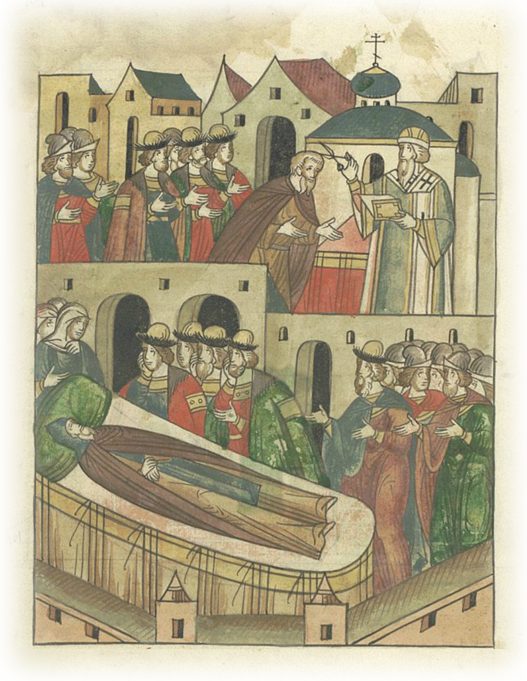 В 6811 (1303) году. Постригся в святой ангельский иноческий образ и в схиму князь великий Данило Александрович Московский, внук Ярославов, правнук Всеволодов, праправнук Юрия Долгорукого, препраправнук Владимира Мономаха, (потомок) пращура Всеволода, прапращура Ярослава, препрапращура великого Владимира, и преставился месяца марта в 4-й день.