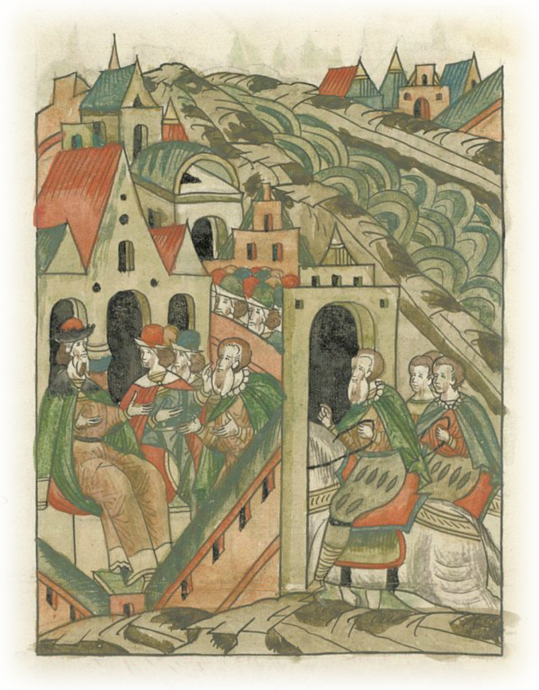Ругодивские посадники Яким и Захар приезжают в Москву. Воеводы царя Ивана Васильевича Алексей Адашев и Иван Михайлов сообщают им, что государь пожалует их, если сдадут его воеводам помимо Ругодива Вышгород.