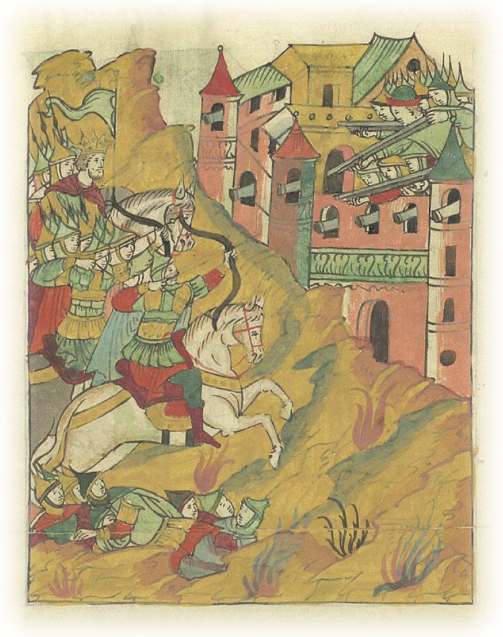Татары же весь день напролет приступали к городу и бились с горожанами; и многих татар из пушек и из пищалей из города побили.