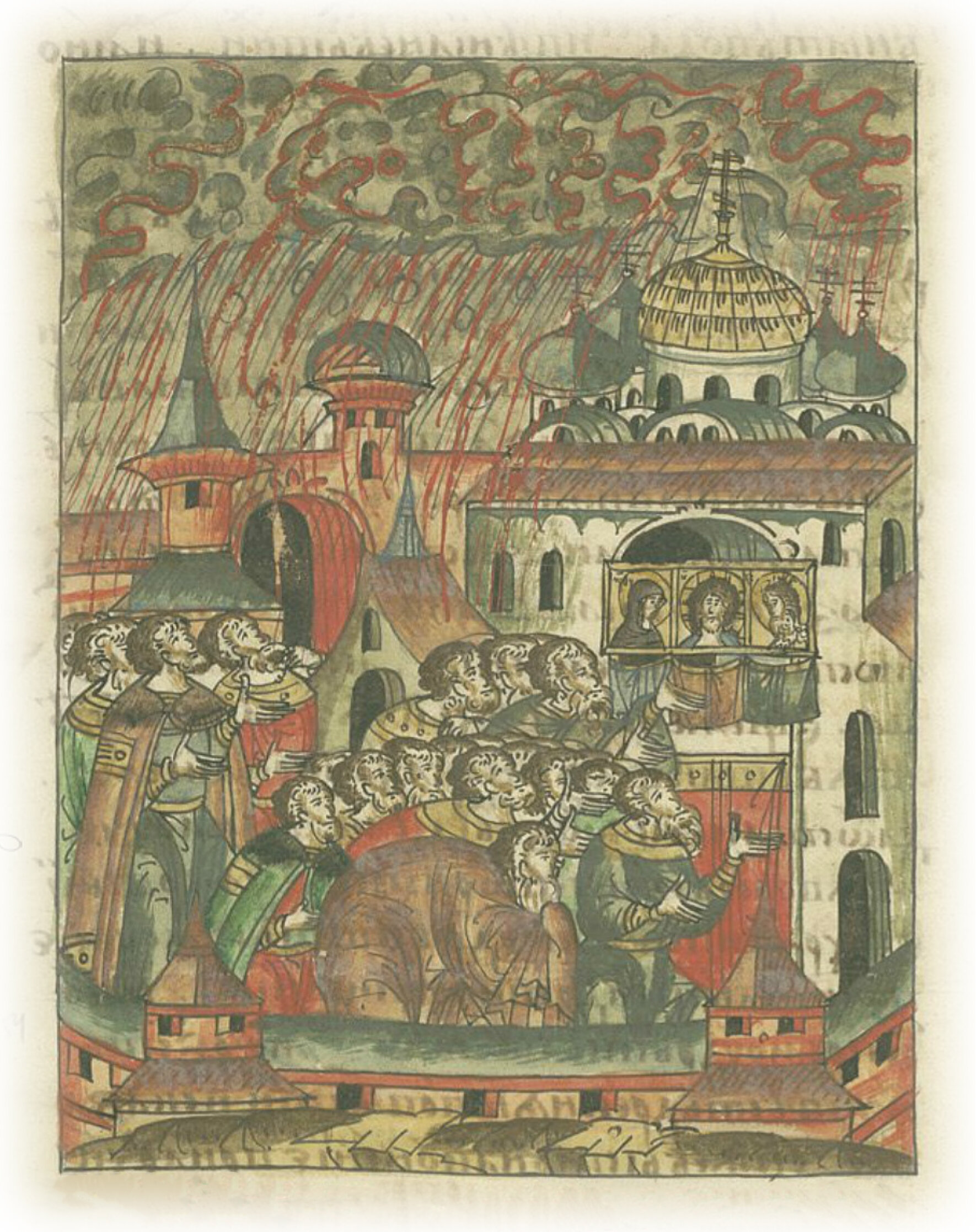 Страшное знамение. В ту же весну месяца мая в 19 день в воскресение, в праздник Всех святых в Великом Новгороде в полночь было сильное сотрясение воздуха: пришла с юга очень темная туча с громом и блистающими молниями, так что невозможно было смотреть на них, ожидали люди, что будут сожжены этим небесным огнем. И встала туча над городом, и казалось, что она несет не дождь, а огонь. Люди решили, что это пламень, испепеляющий грешников, ужаснулись и стали громко взывать: «Господи, помилуй!», также приносили много других молений и обетов Господу и Пречистой Его Матери Богородице и всем Его святым. И начался сильный дождь с градом, камни падали из облаков на землю. Архиепископ Симеон со священным собором и всеми богобоязненными людьми собрались в церкви Софии Премудрости Божьей, упали на пол и стали молиться со слезами, с воздыханиями из глубин сердца; также и в остальных церквях священники вместе с людьми молились. Прошла страшная ночь. Наступил день, воссиял свет, наступила тишина, и та огненная туча исчезла. Едва люди пришли в себя от того страха! Устрашимся и мы, услышав такую страшную повесть, научимся творить добро, хранить заповеди Господни, чтобы получить благо.