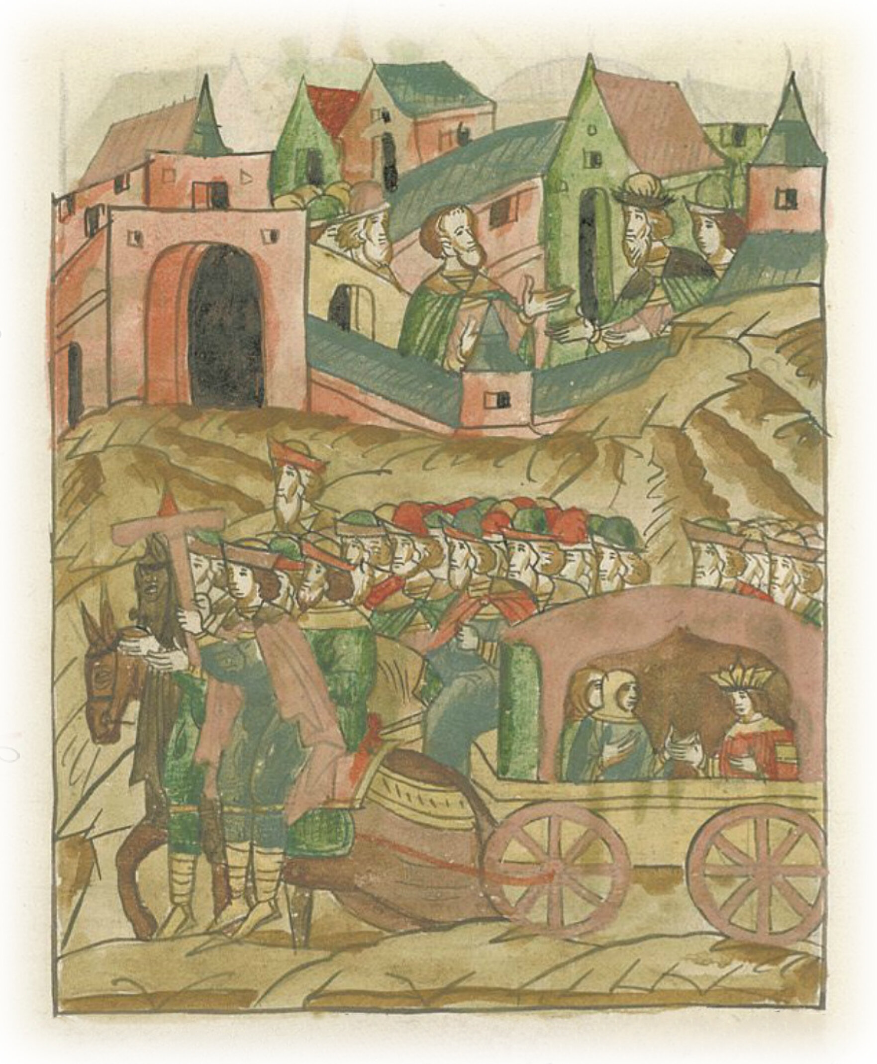И когда они были уже близ Москвы, сказали великому князю, что тот посол легат Антоний идет с царевною, а пред ним крыж* несут, ибо папа такую почесть великую дал послу своему – идти так ему по всем землям их и до Москвы из-за великого государства земли сей и дальнего расстояния. * крест латинской формы