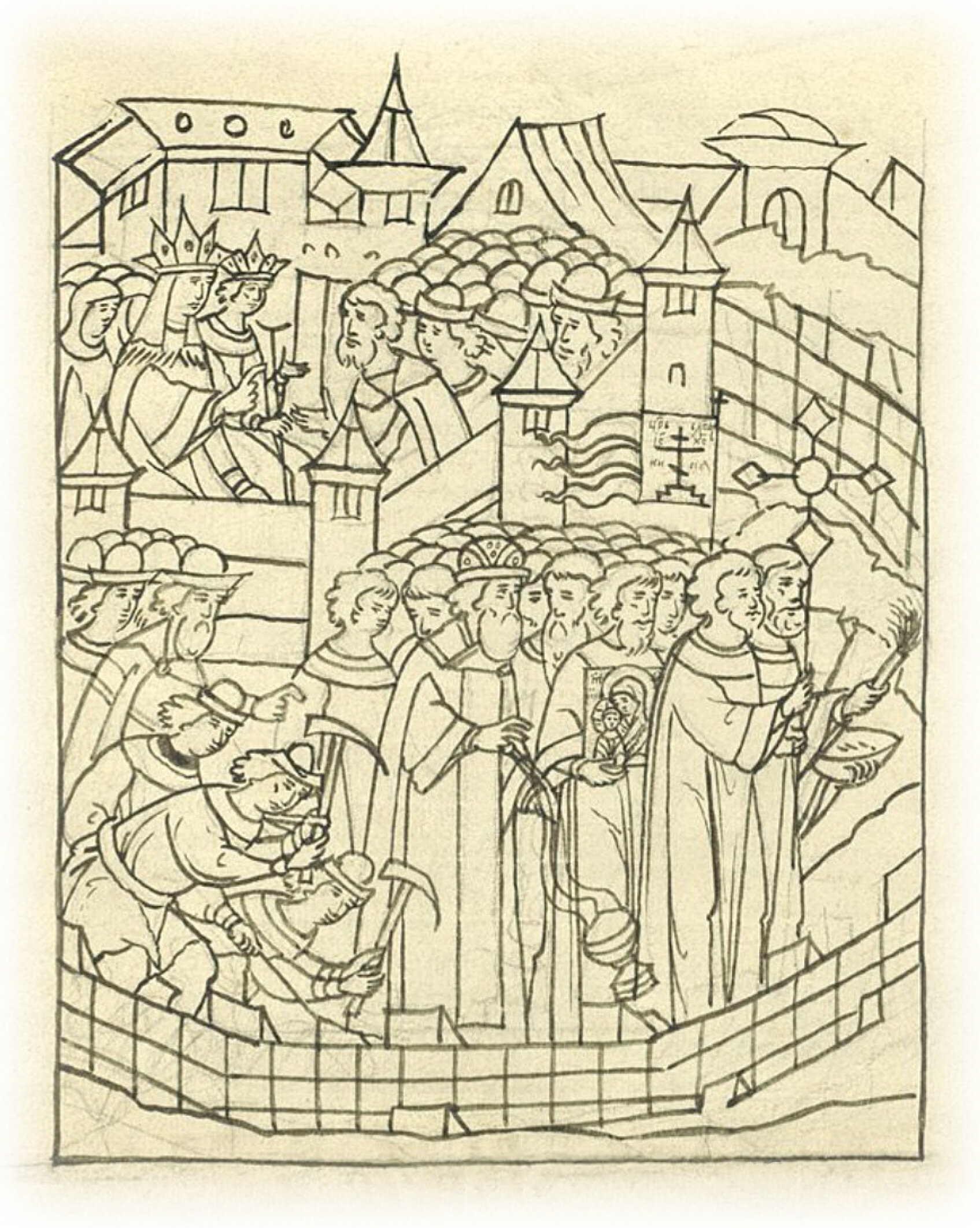 В том же году в мае в 16 день князь великий Иван Васильевич всея Руси и его мать великая княгиня Елена повелели город каменный ставить возле земляного города; и в тот день повелели отцу своему Даниилу митрополиту со всем освященным собором с крестами и иконами идти по тем местам, где городу быть, и святою водой кропить; а мастеру Петру Малому Фрязину повелели подошву стенную основать.