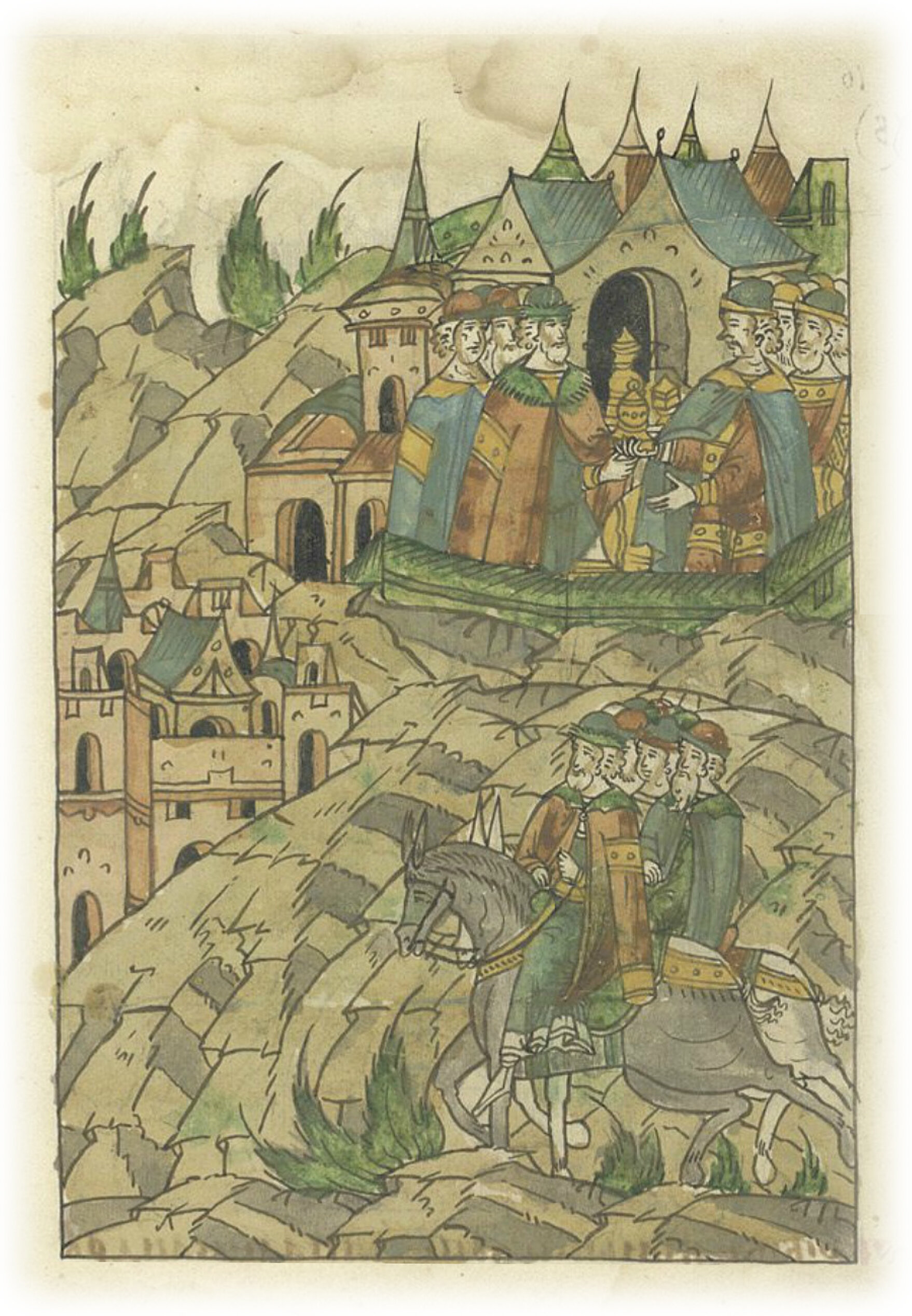 Ругодивские посадники Яким и Захар приезжают в Москву. Воеводы царя Ивана Васильевича Алексей Адашев и Иван Михайлов сообщают им, что государь пожалует их, если сдадут его воеводам помимо Ругодива Вышгород.
