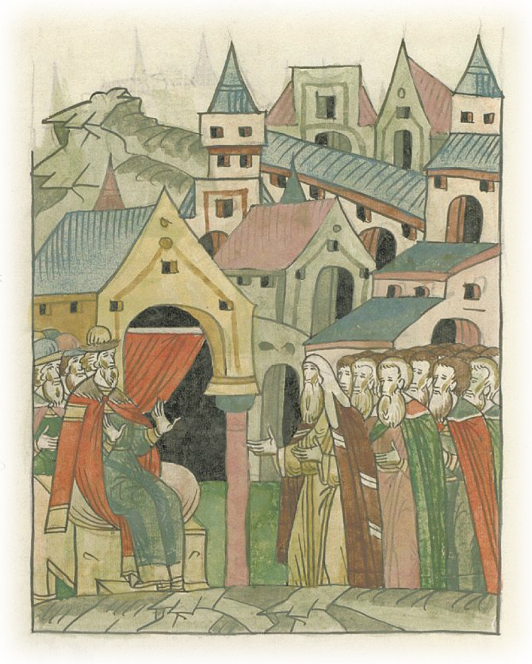 Великий князь Иван Васильевич не принимает просьбы архиепископа Феофила и посадников отменить наказание провинившимся боярам.